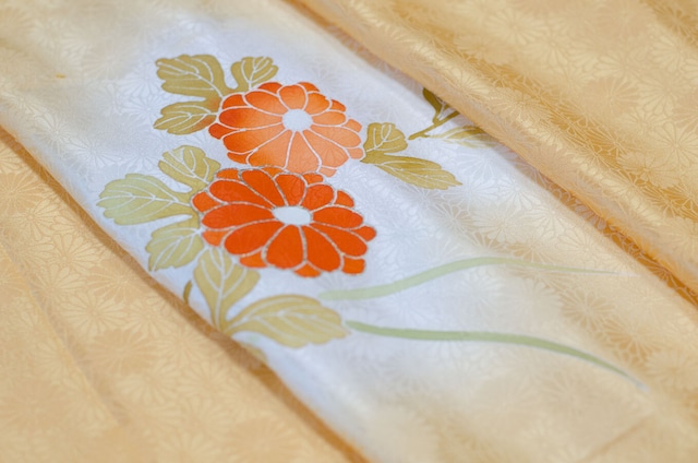正絹 山吹色菊柄訪問着ハギレ 1.2m 和小物、つまみ細工などに