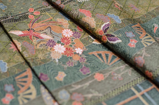 濃い緑に花や蝶m扇面などが複雑に描かれた小紋ハギレです。 金彩も使われています。 汚れなく状態良好です。 つまみ細工や和のお細工ものなどにお使いください。 サイズ:約36センチ×約100センチ <ご注意> ・状態のいいものを選んではおりますが、折り跡や小さなキズ、色あせ、汚れ、耳への切込みがある場合があります。 ・保管臭がある場合があります。 ・解き糸くずが残っている場合があります。