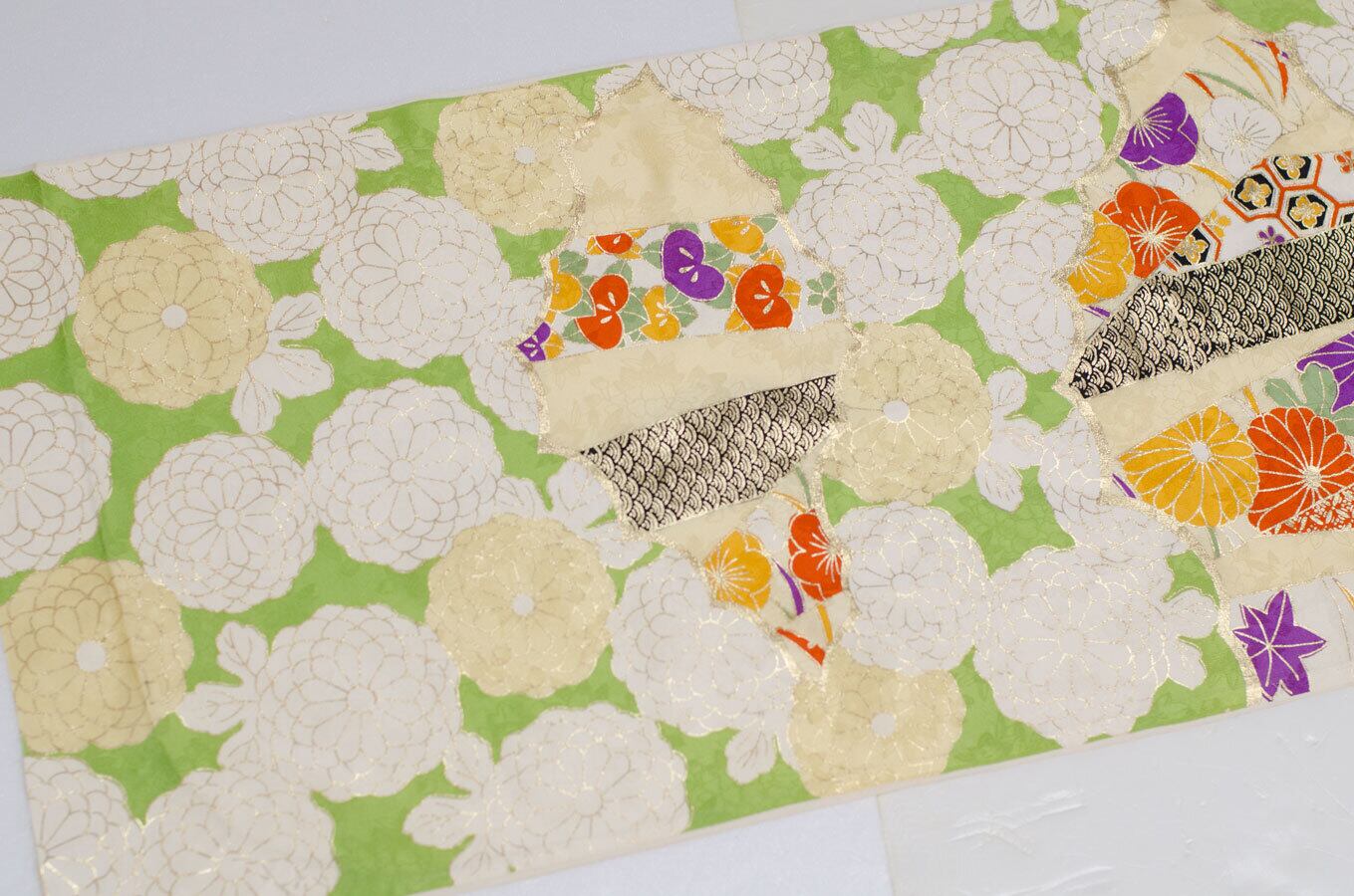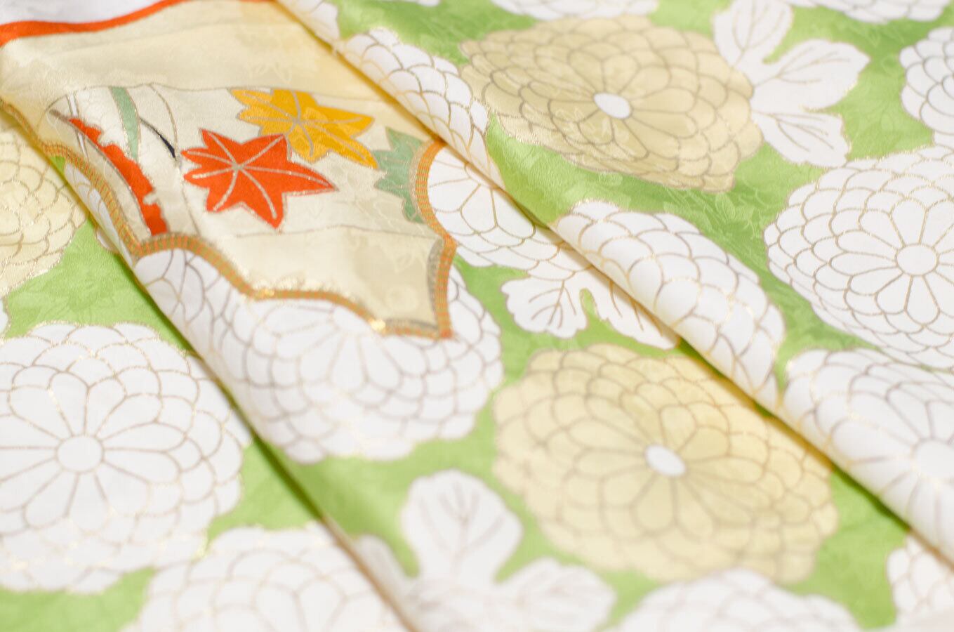 鮮やかな黄緑の地に菊柄の振袖はぎれです。