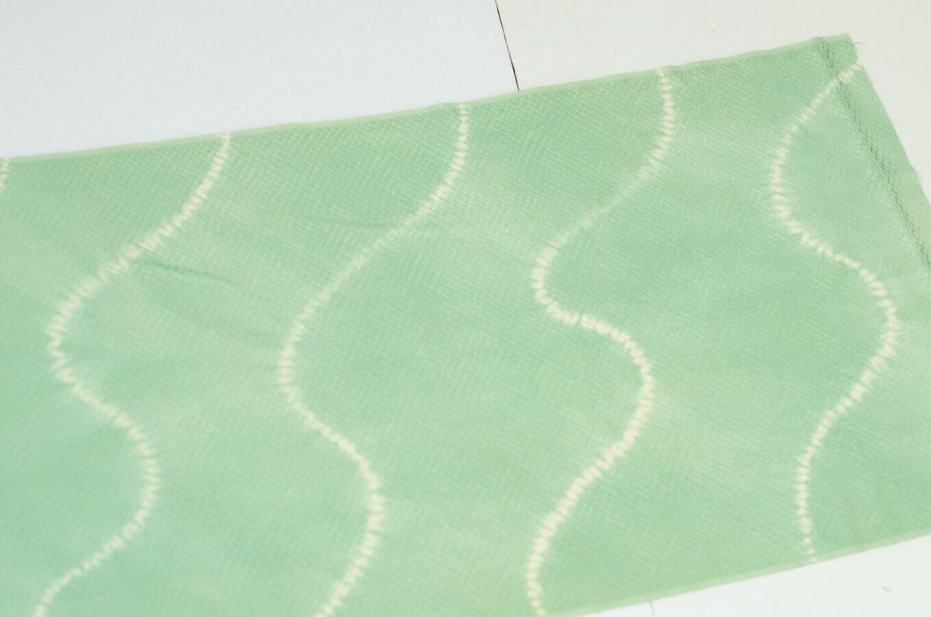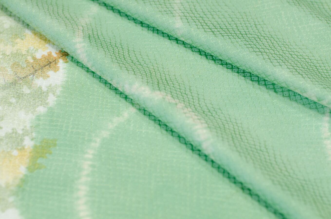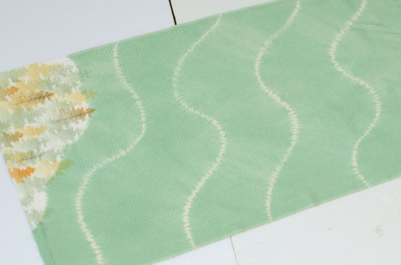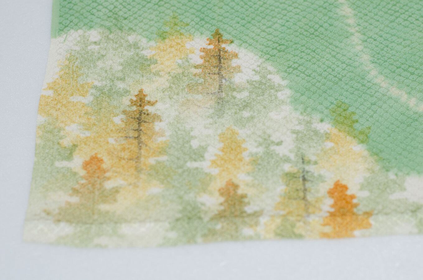 浅緑色(#88cb7f やや灰味の明るい緑)の地に木立が描かれた訪問着ハギレです。