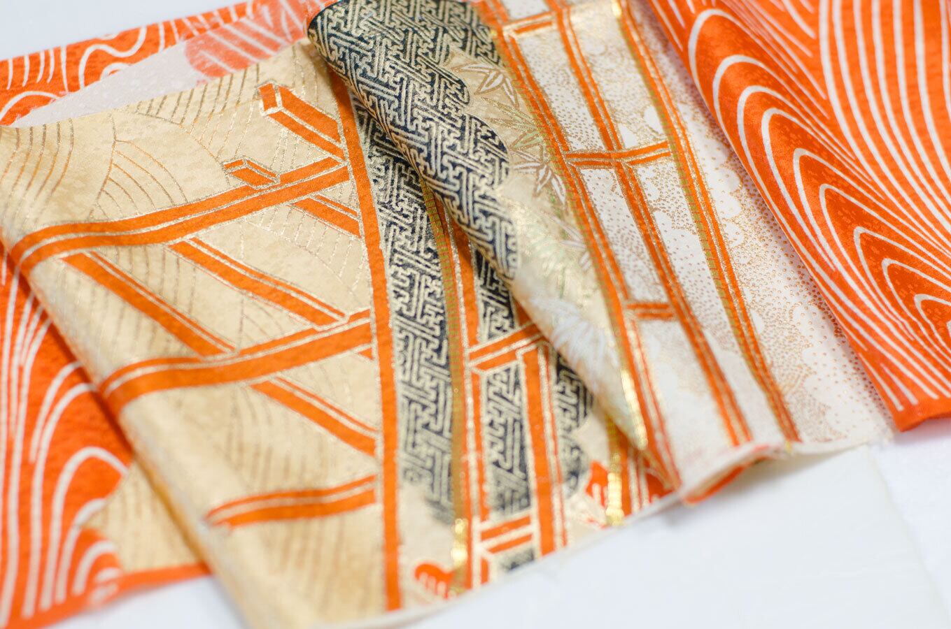 鮮やかなオレンジ地に全面に流水の柄、一部に橋の柄はいった訪問着のハギレです。