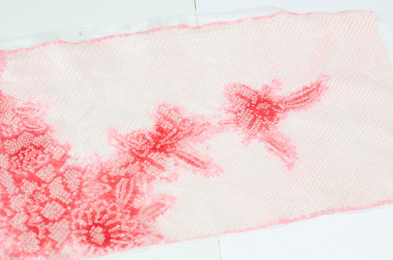 明るいピンクに赤い花柄の総絞りの振袖はぎれです。