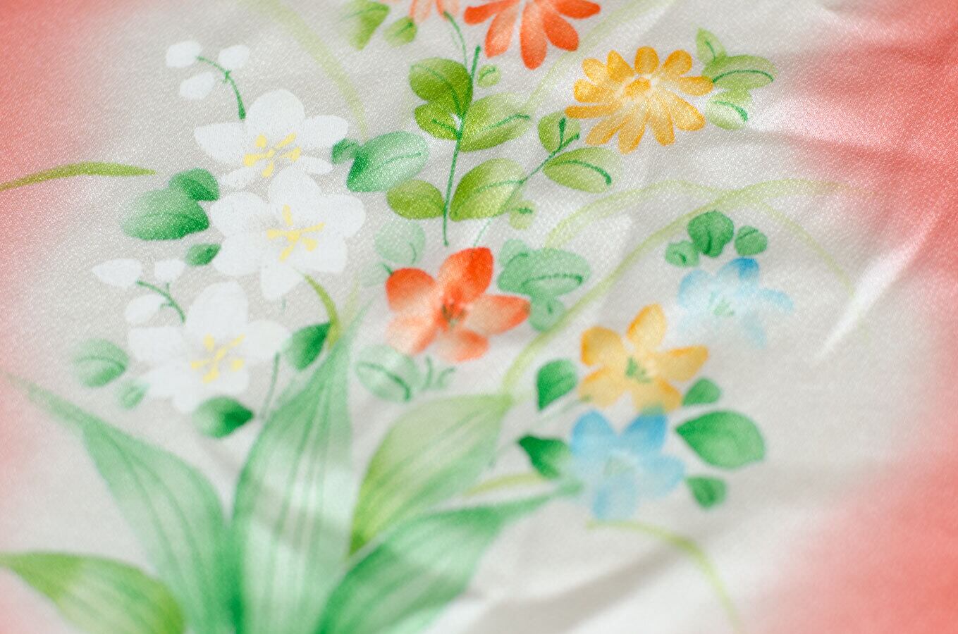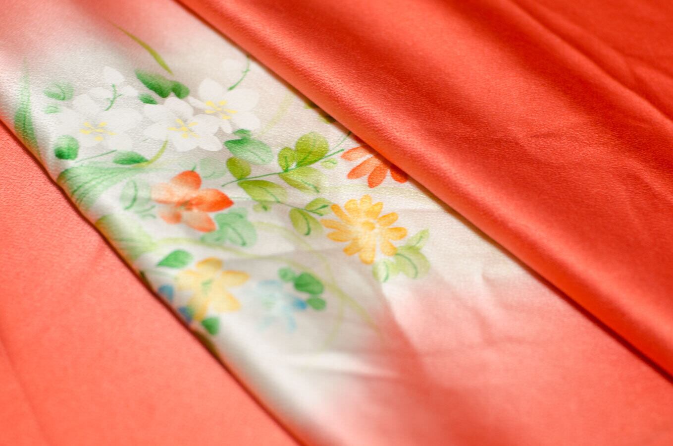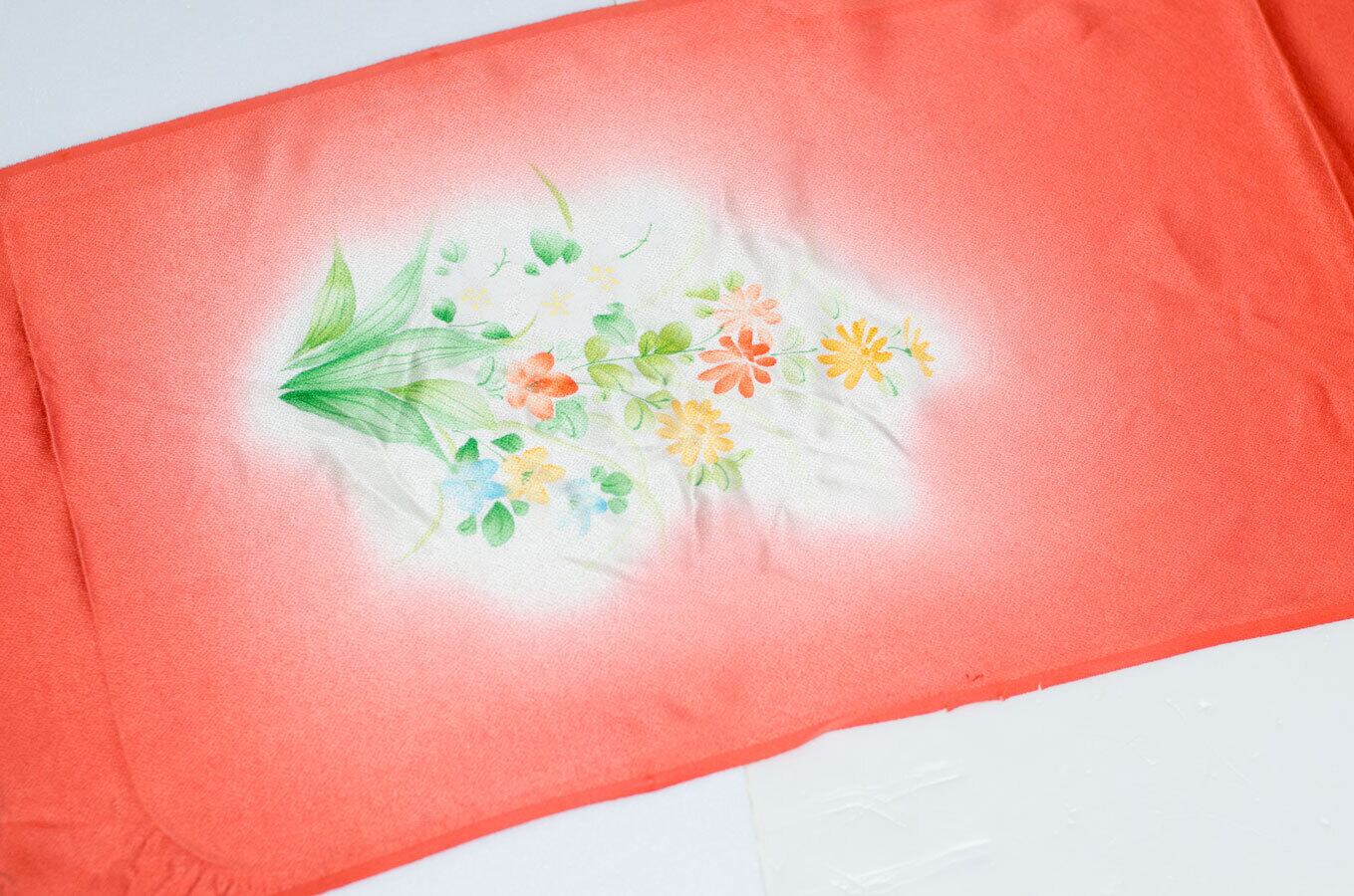 明るい朱よりの赤地にかわいい花柄の訪問着はぎれです。