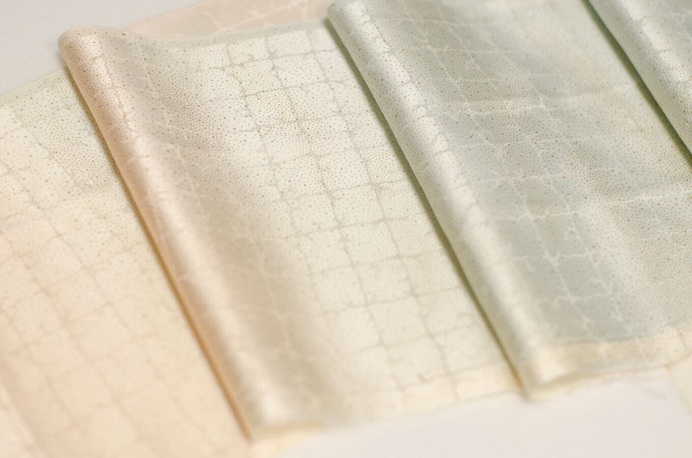艶のあるピンクと水色のぼかしの生地で全体に金が散らされています。