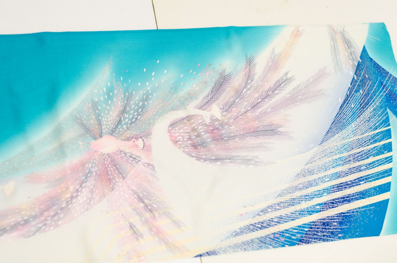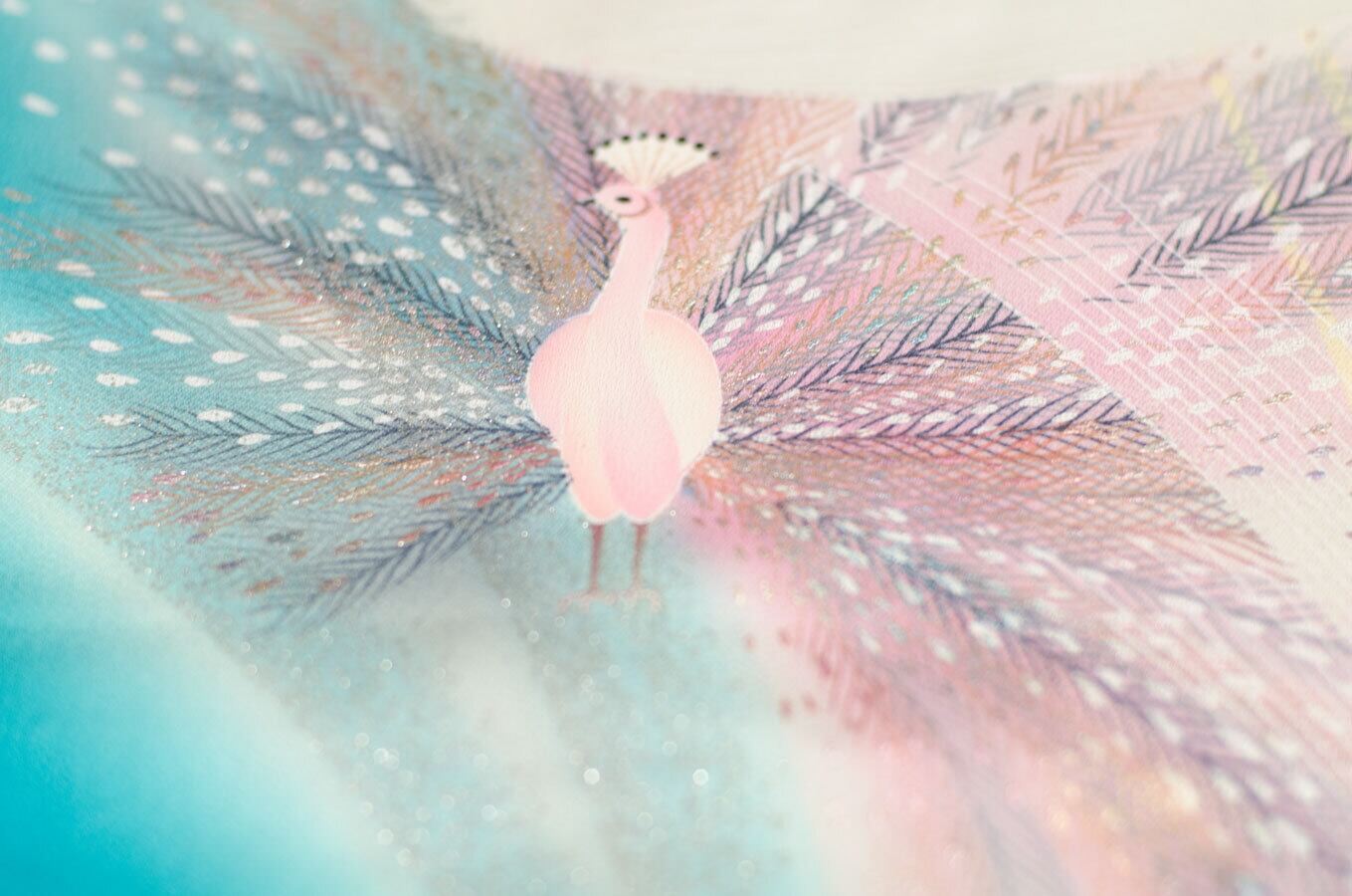 やや黄色よりの水色メインの地に孔雀が描かれた振袖ハギレです。