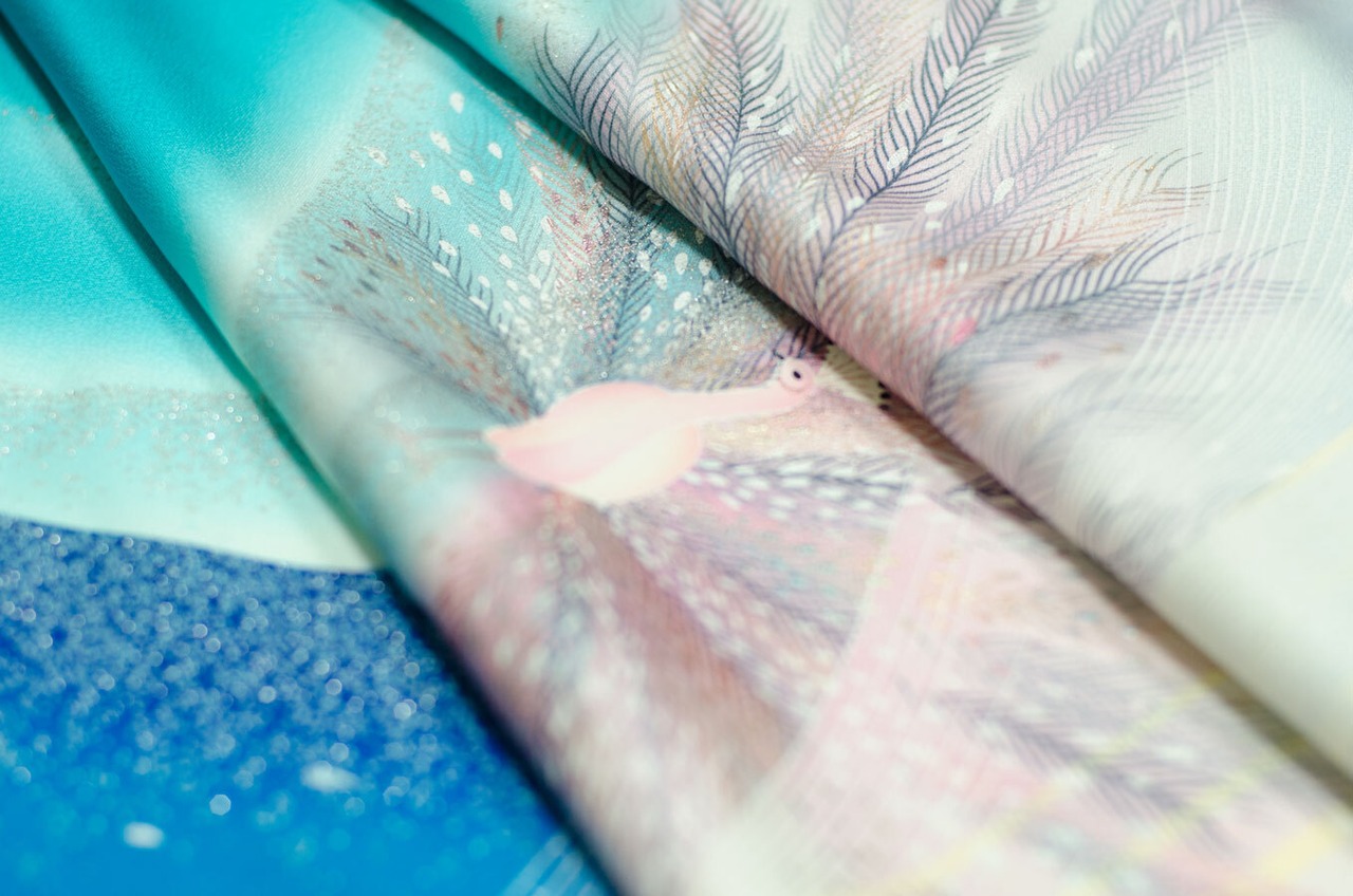 銀彩やオーロラ箔が多く使われたキラキラ感の強い生地です。
