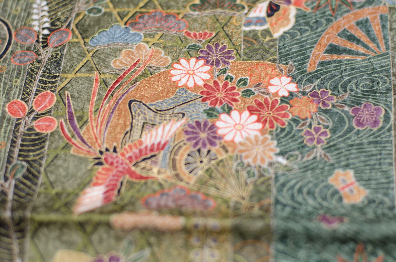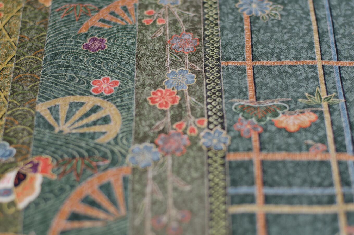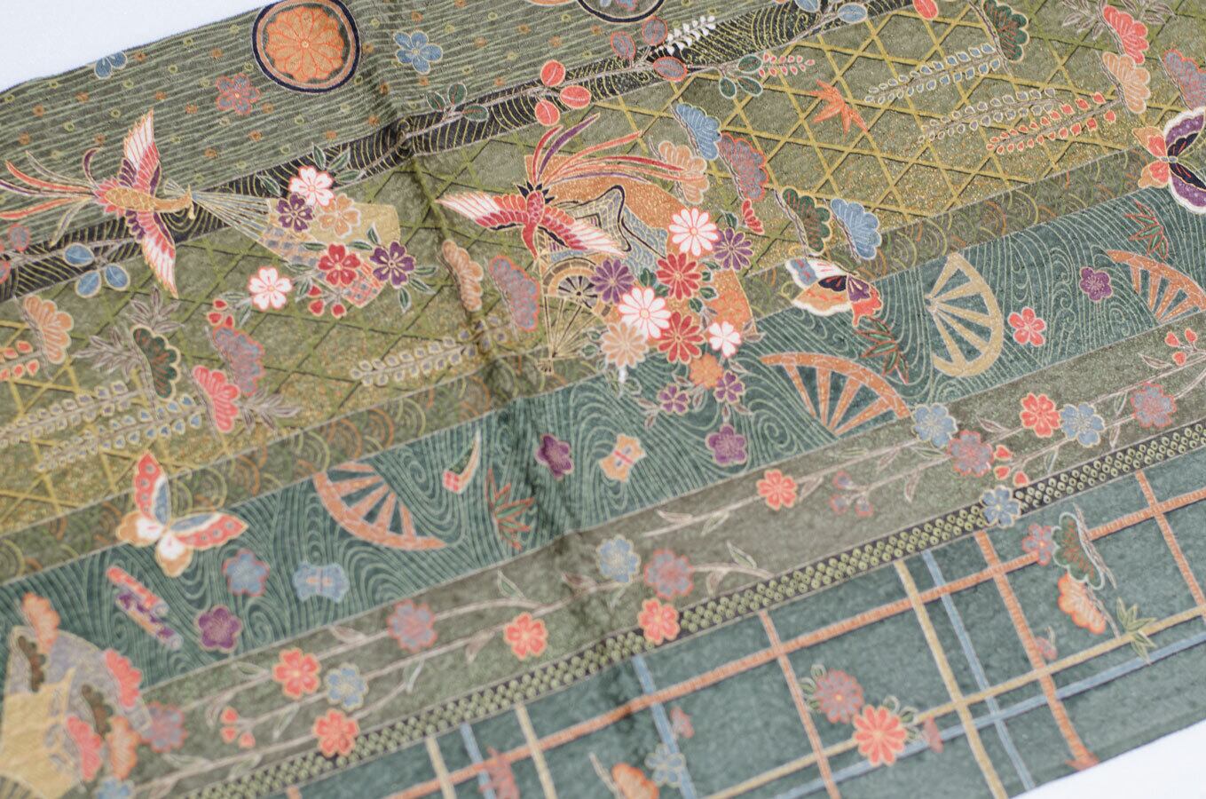 濃い緑に花や蝶m扇面などが複雑に描かれた小紋ハギレです。