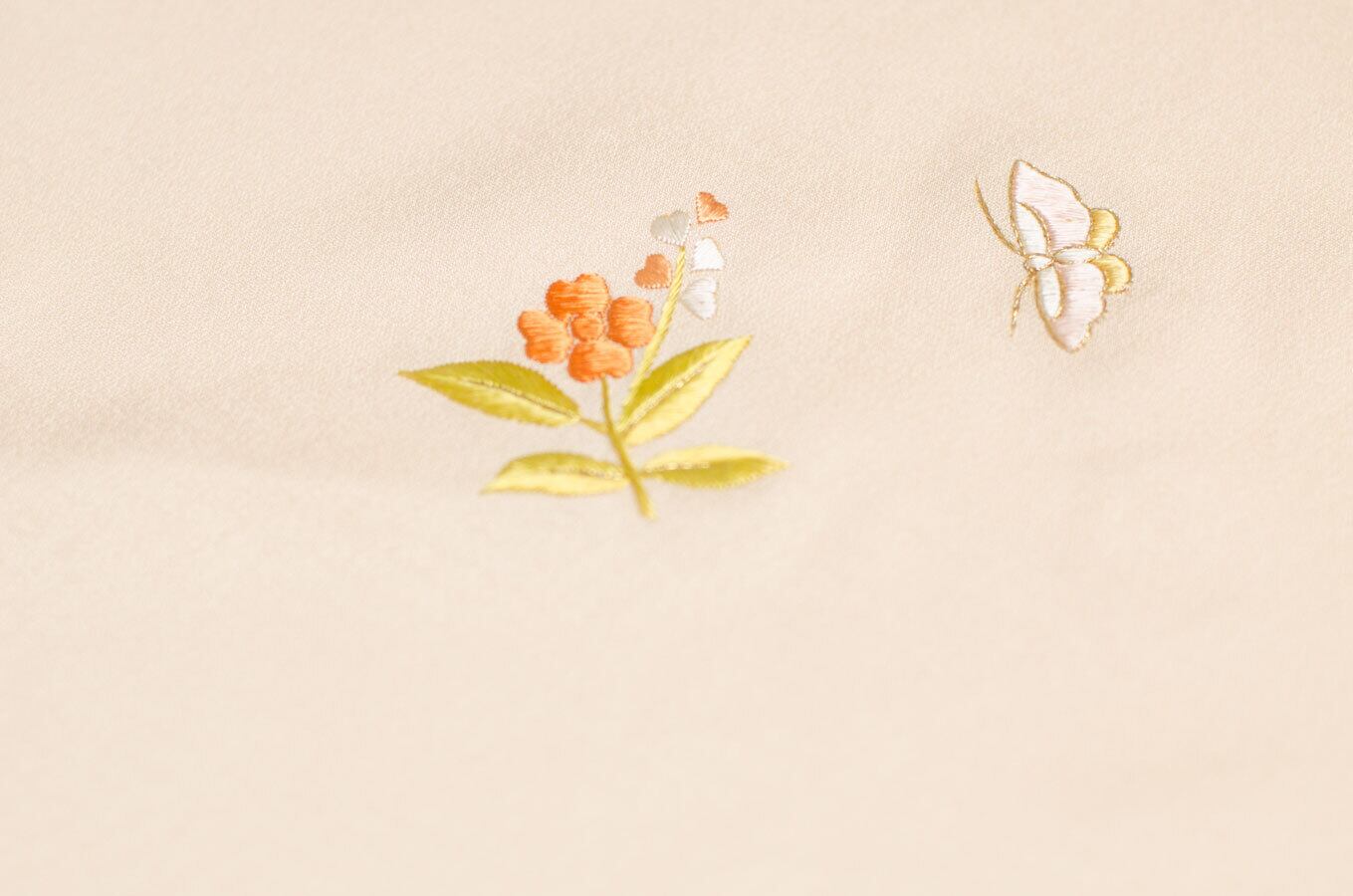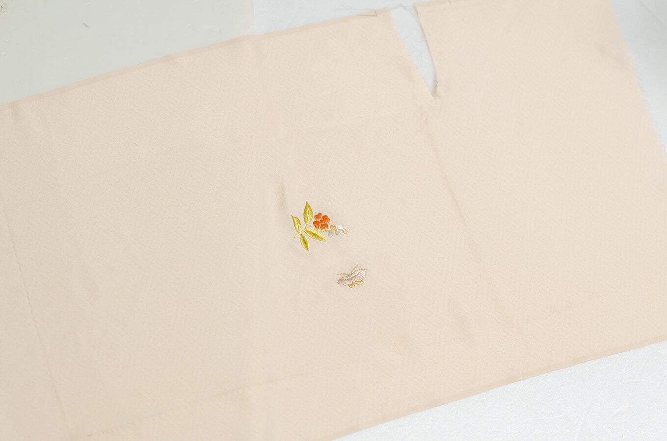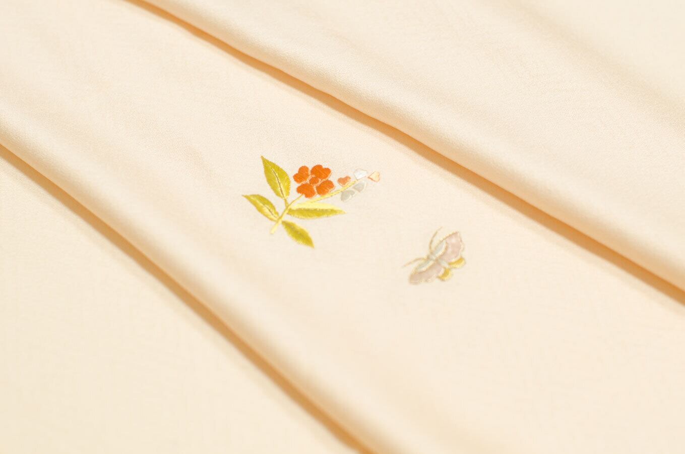 ごく薄いオレンジにポイントのように刺繍が入った訪問着はぎれです。
