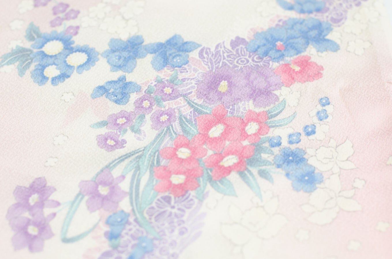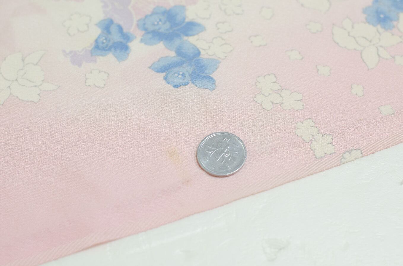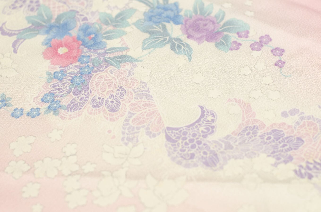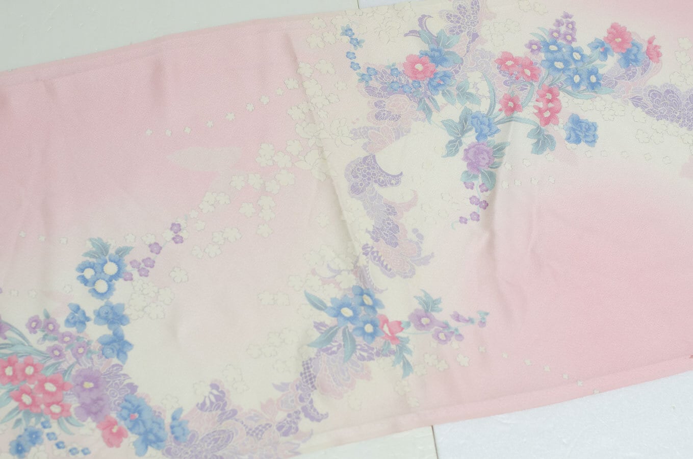 明るいきれいなピンク地にレースのような花柄の小紋はぎれです。