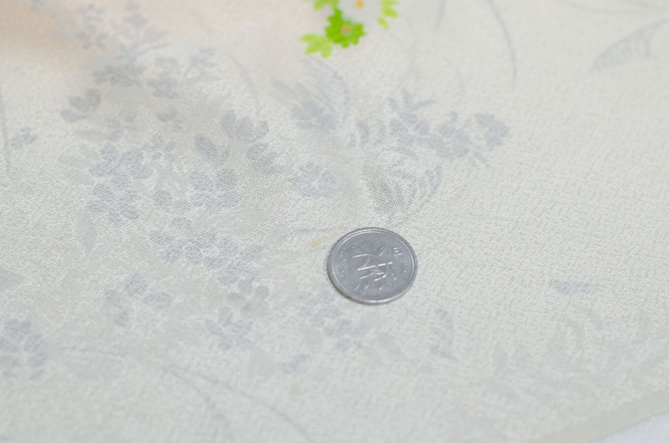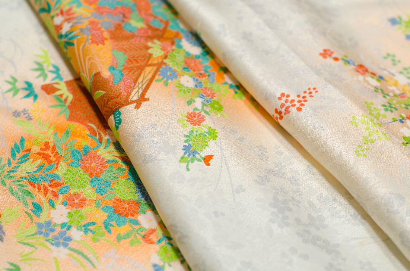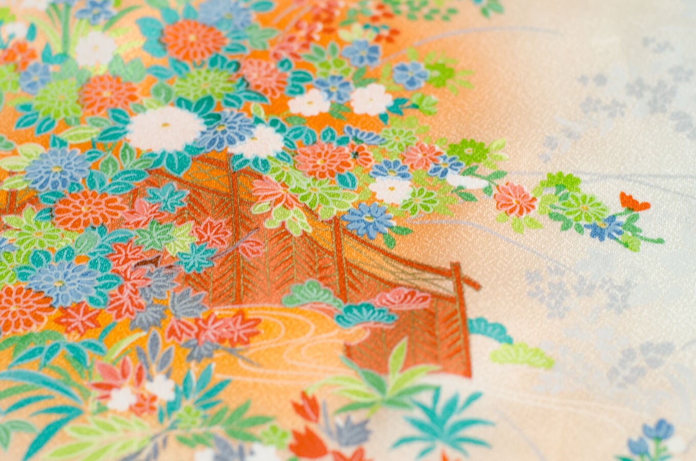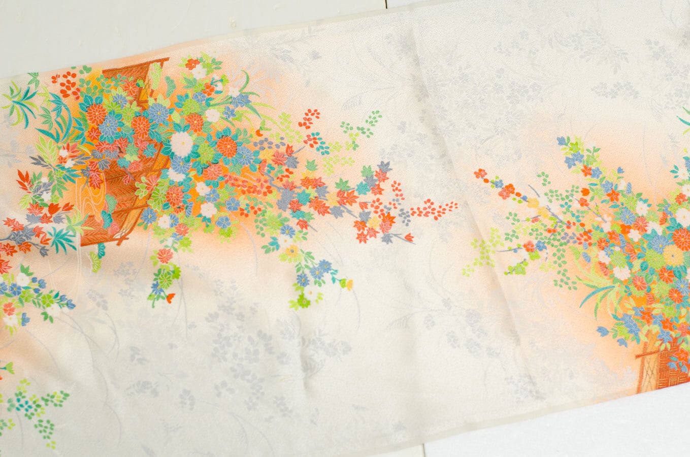 白地にオレンジのぼかしと花柄、塀が描かれた小紋の解きハギレです。