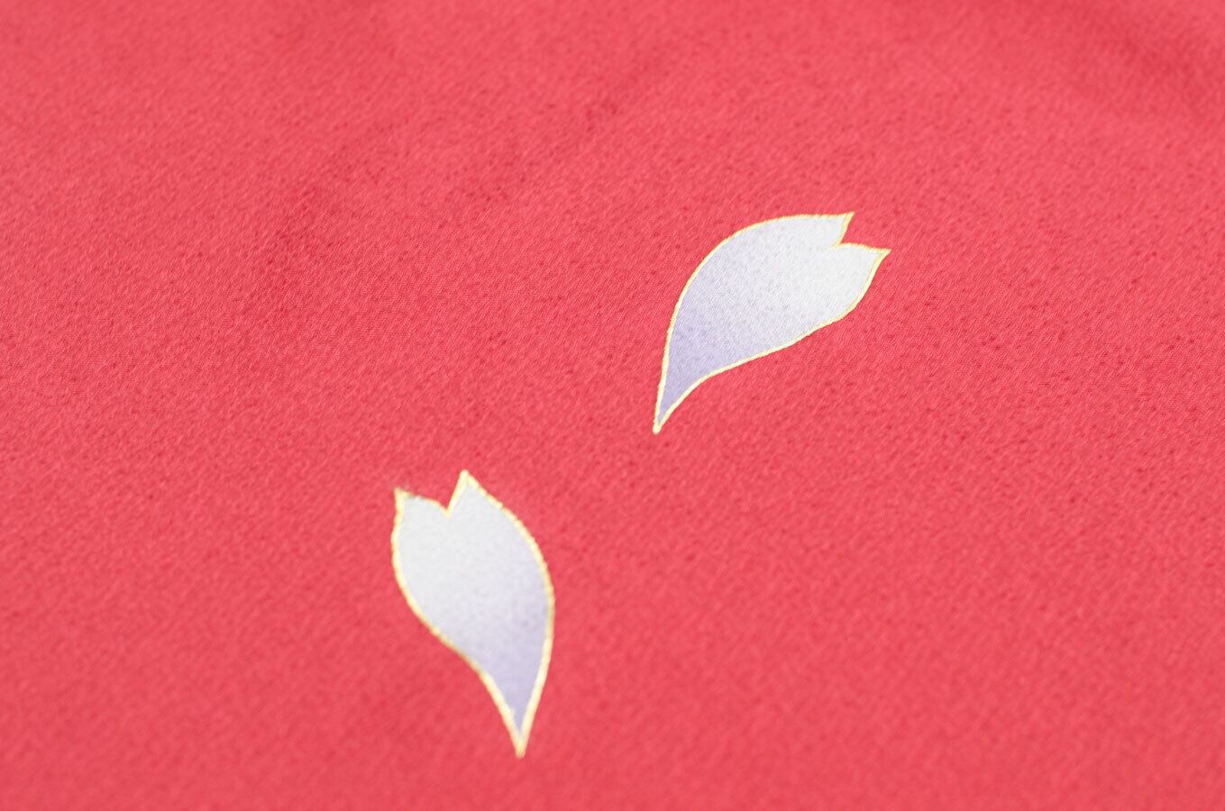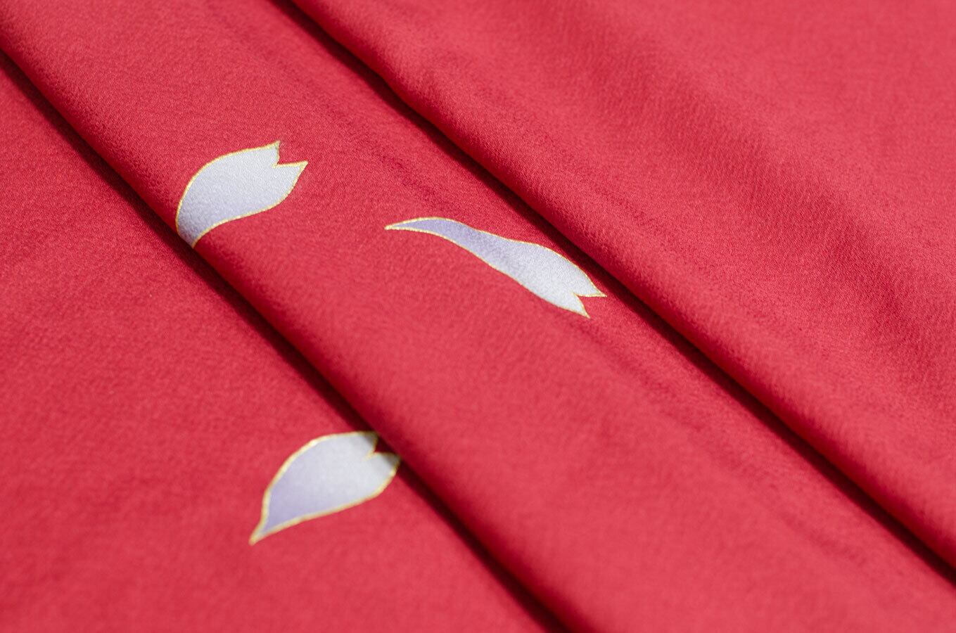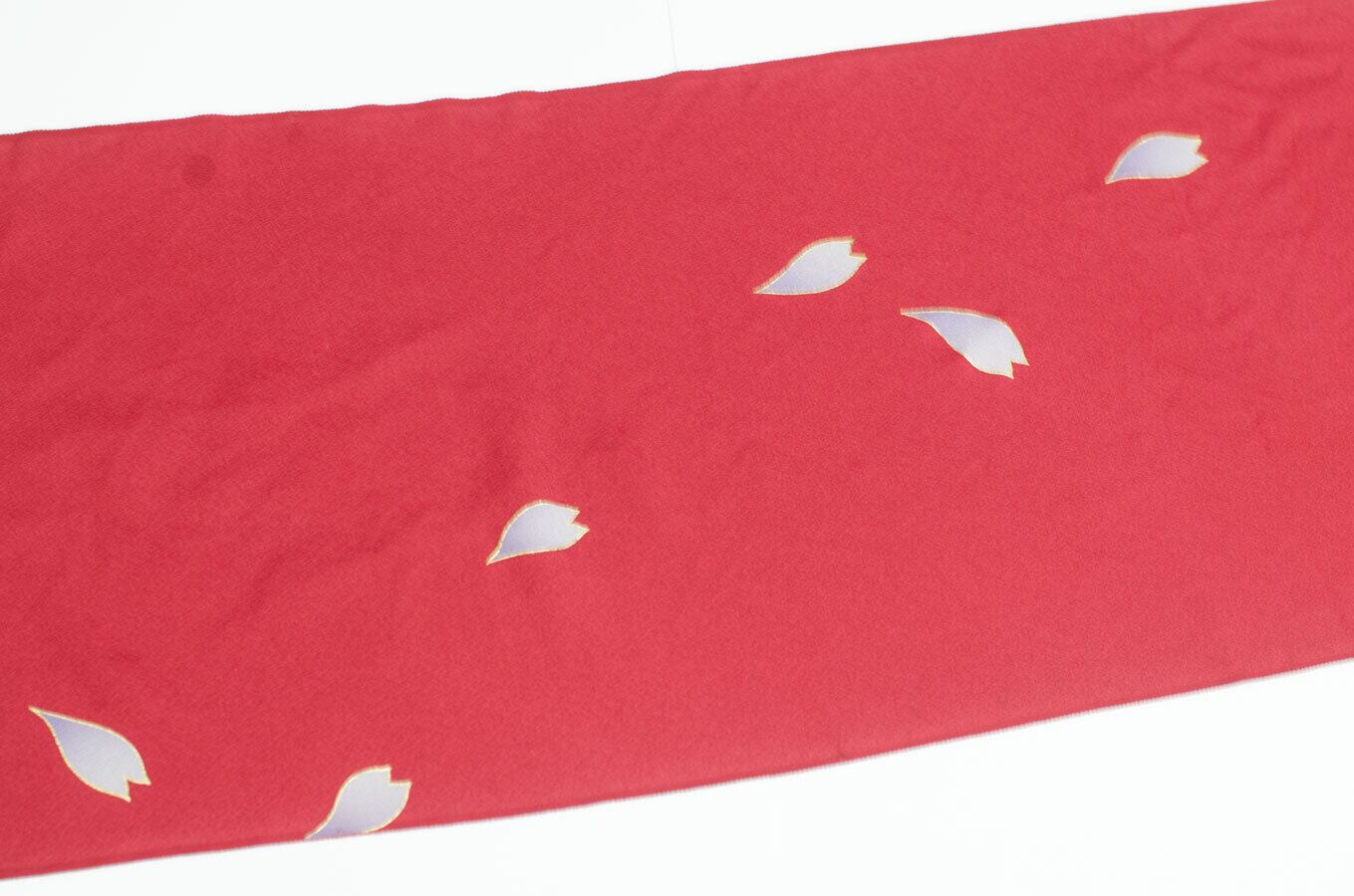 こっくりとした深い赤地に桜の花びらが描かた振袖見本はぎれです。