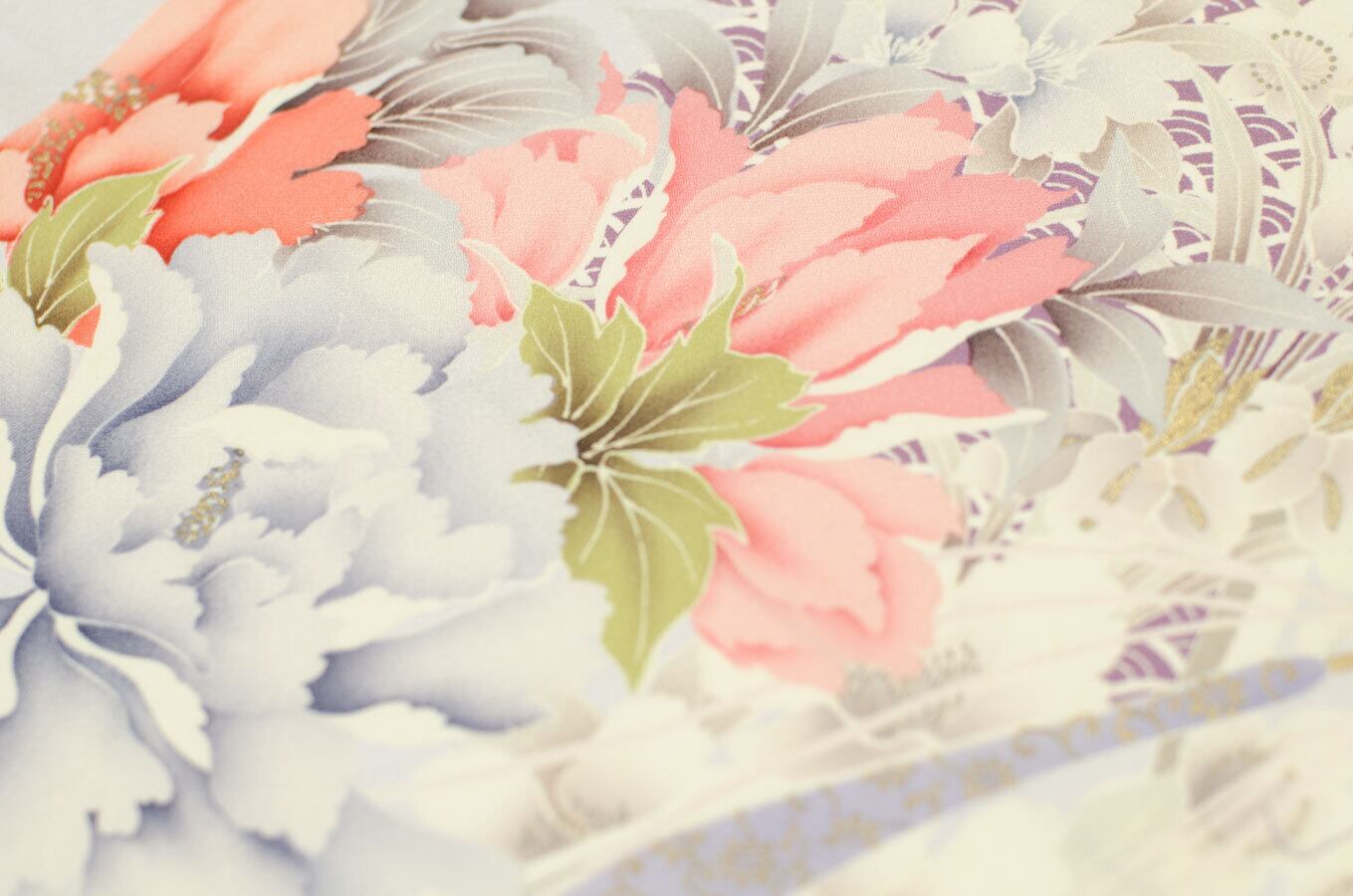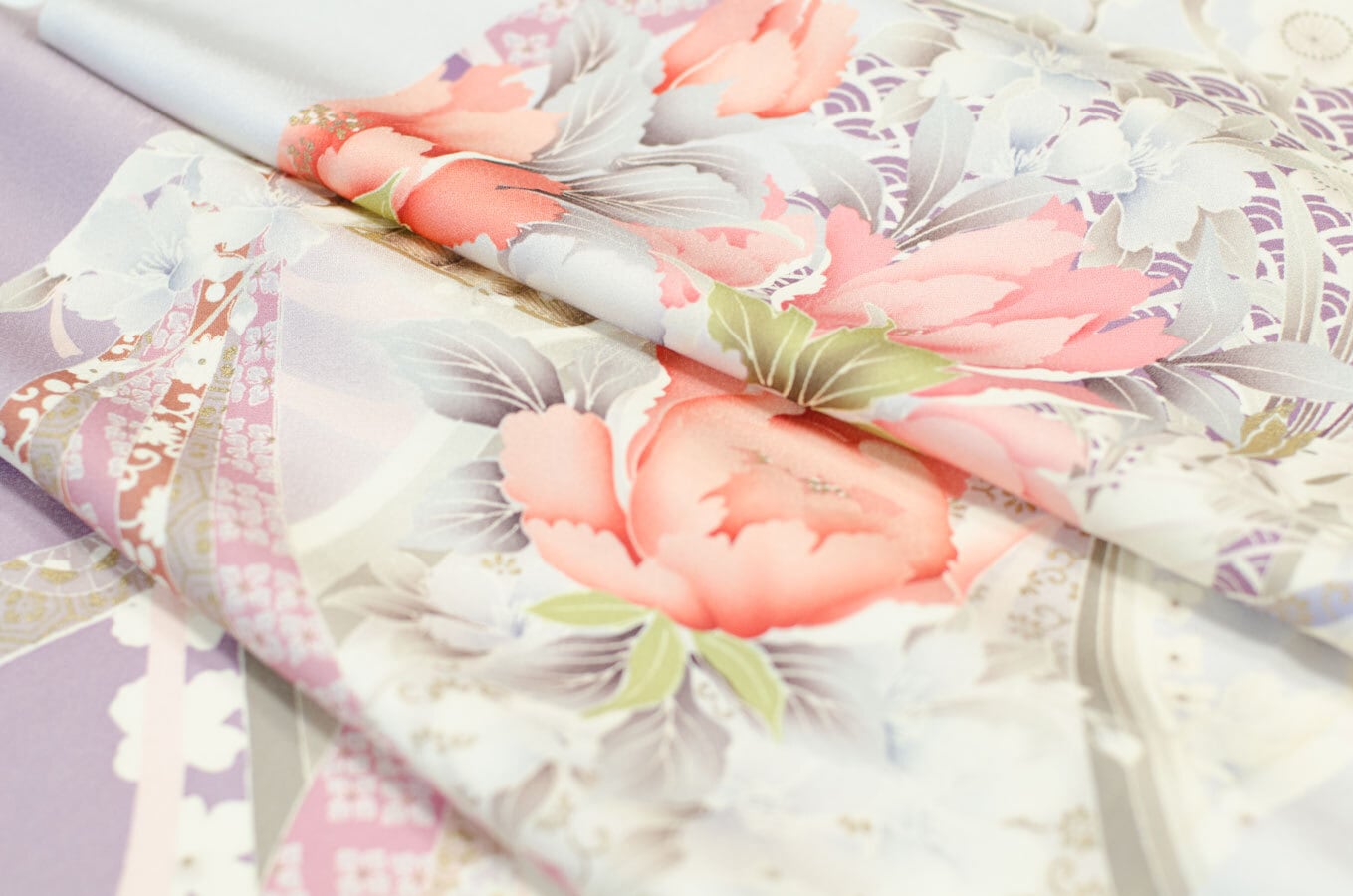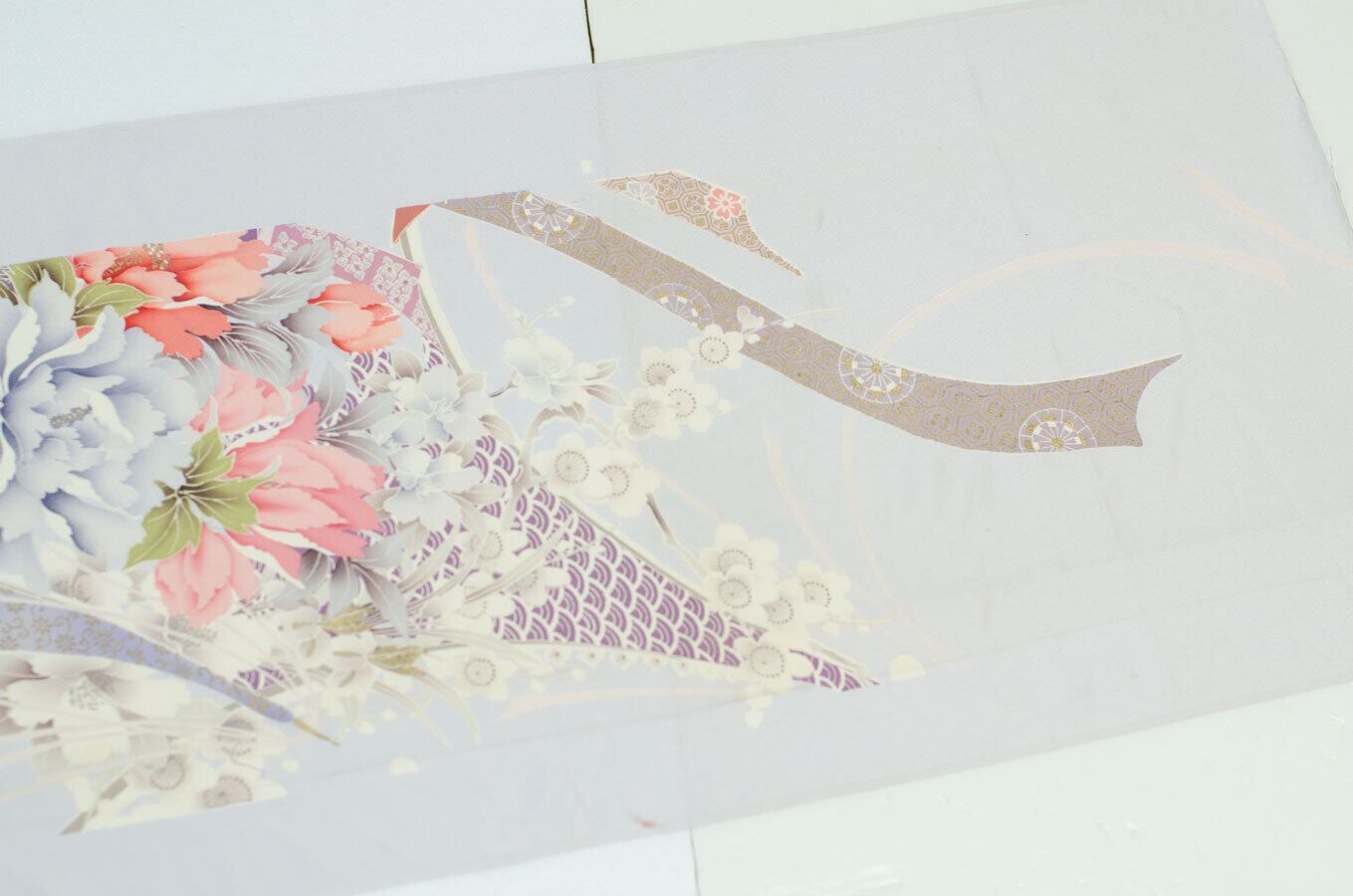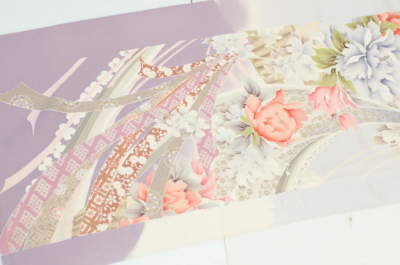 上品な薄紫に牡丹と熨斗目、熨斗目を組み合わせたような鶴の柄の振袖はぎれです。