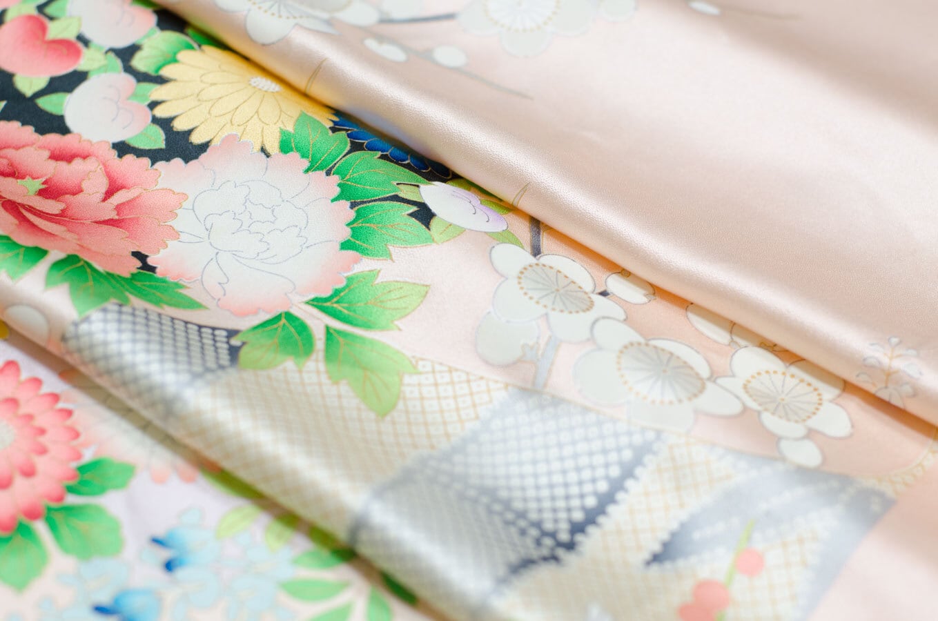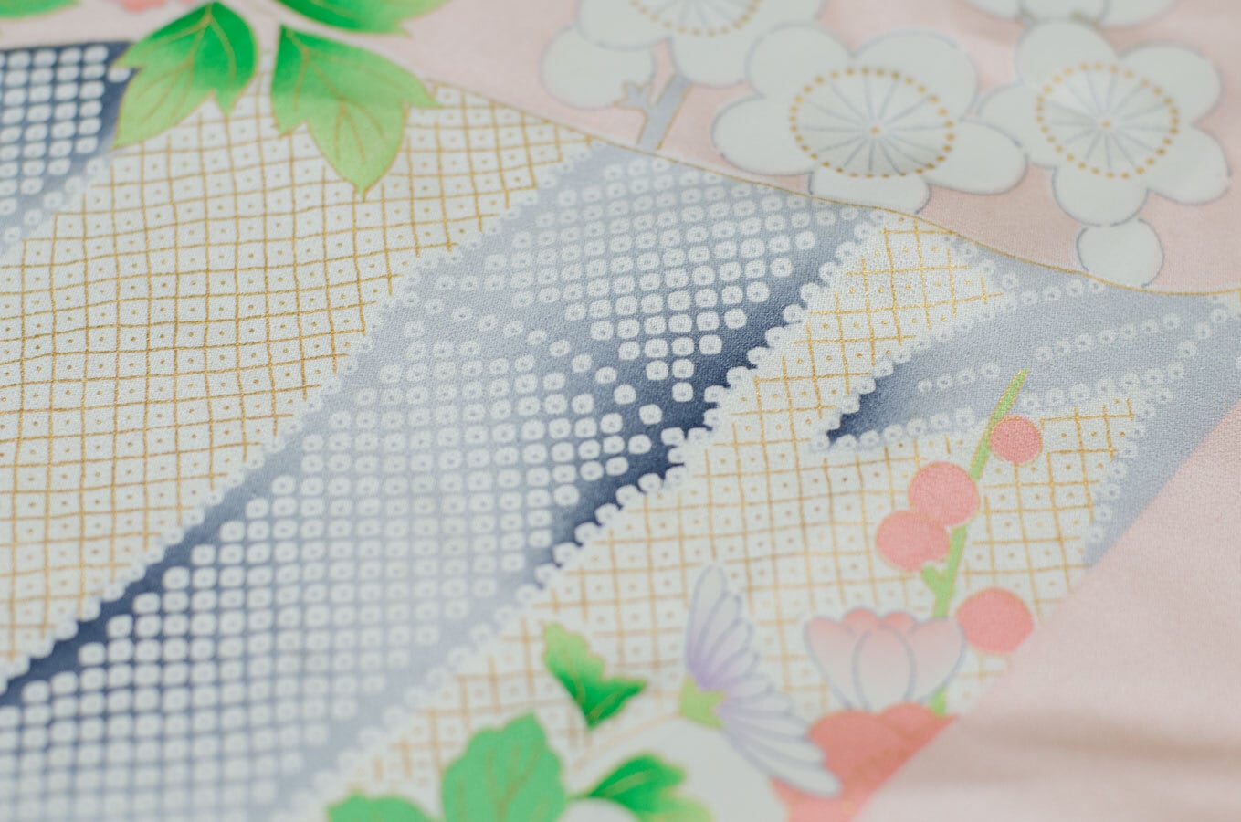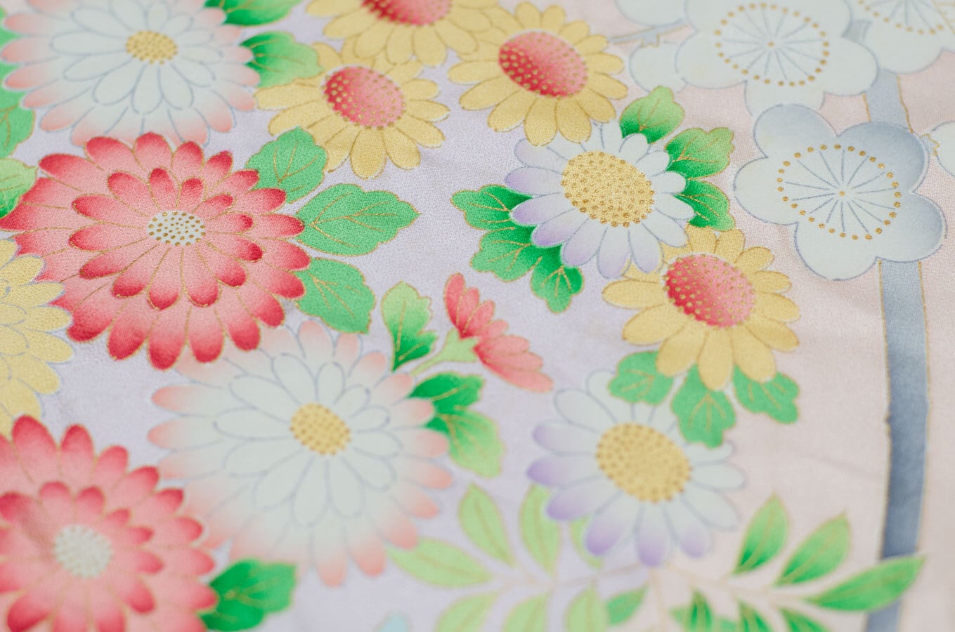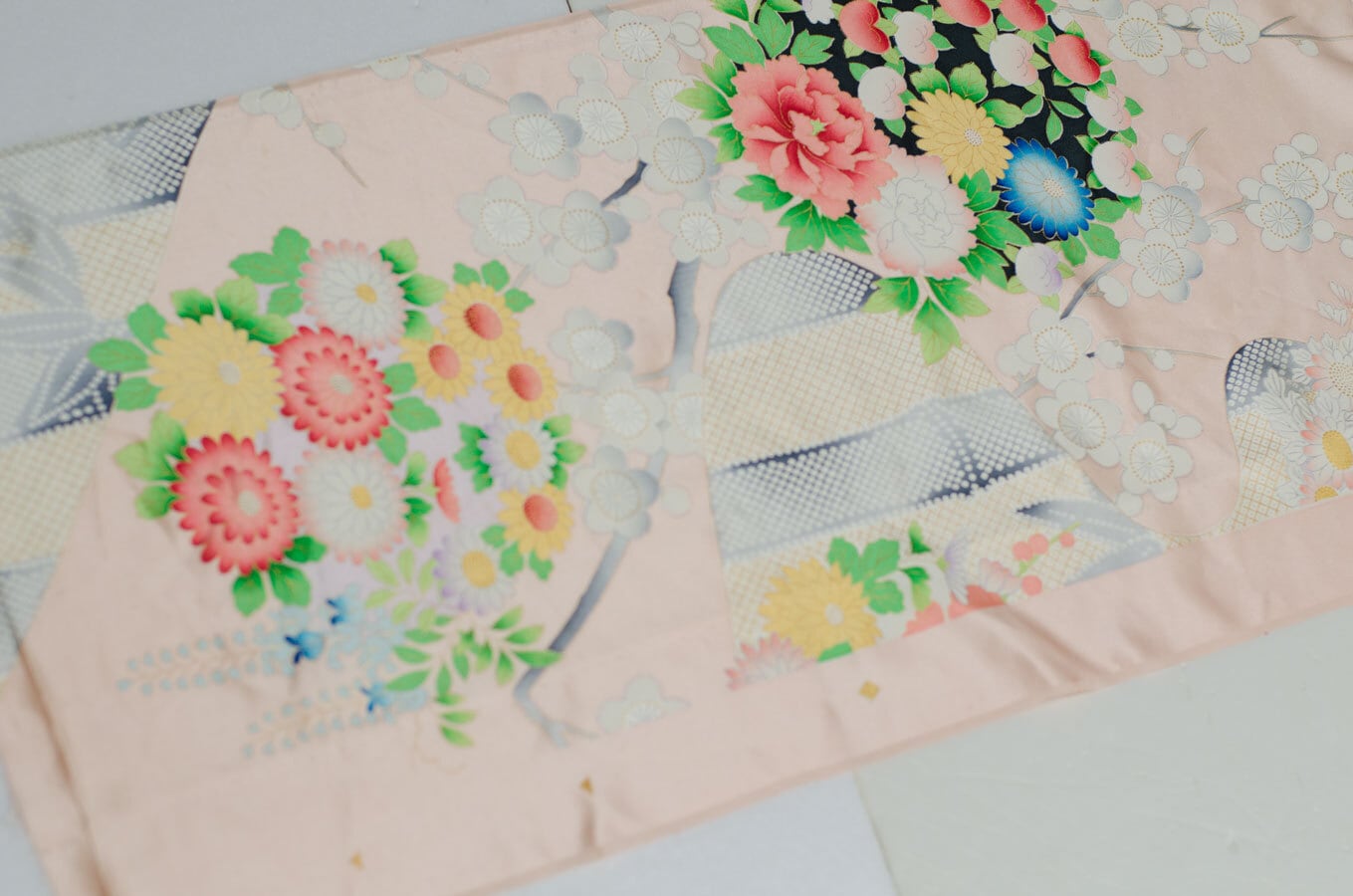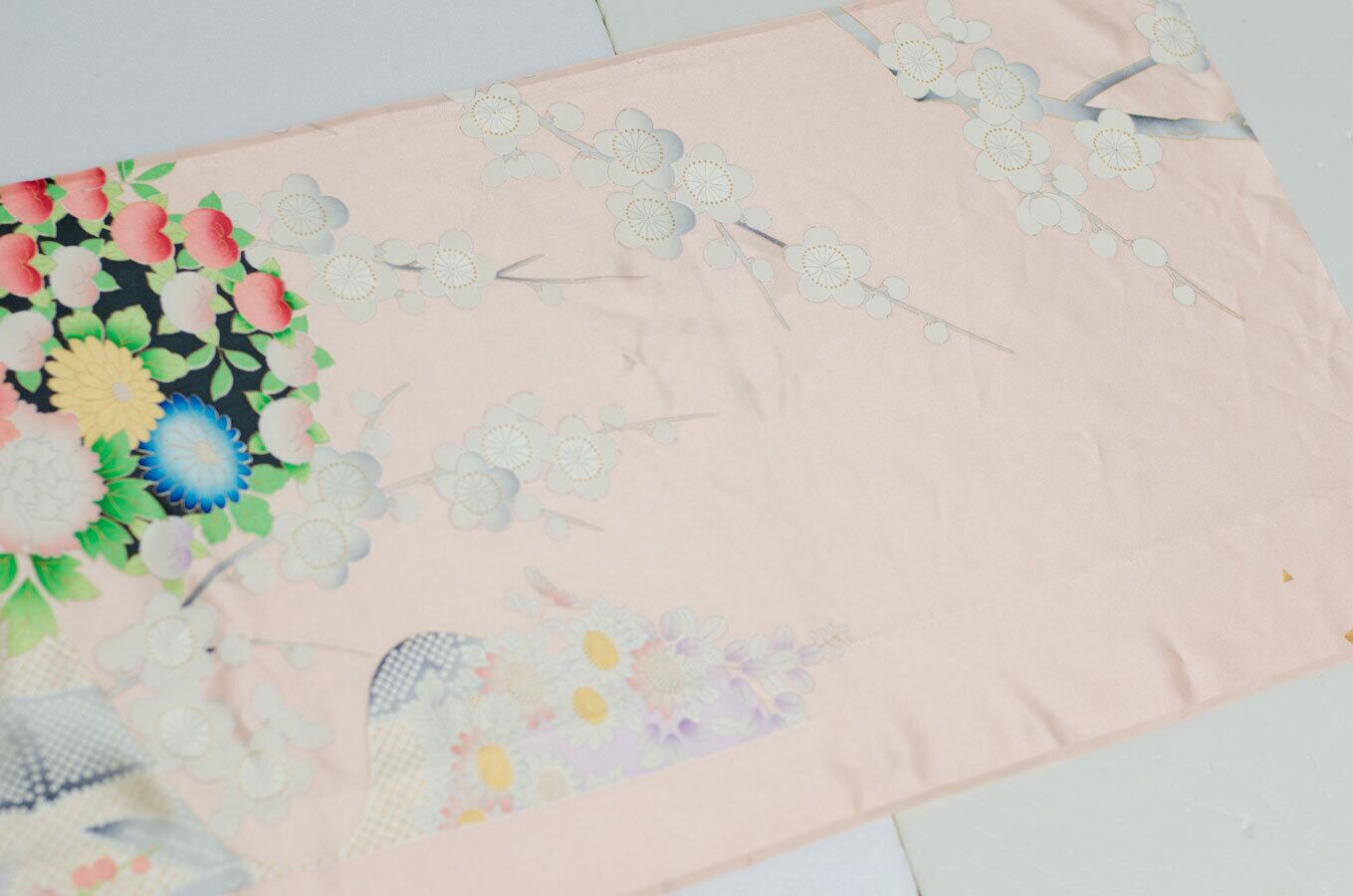 淡い優しいピンクの地に花丸模様、花柄、染め匹田の柄の振袖ハギレです。