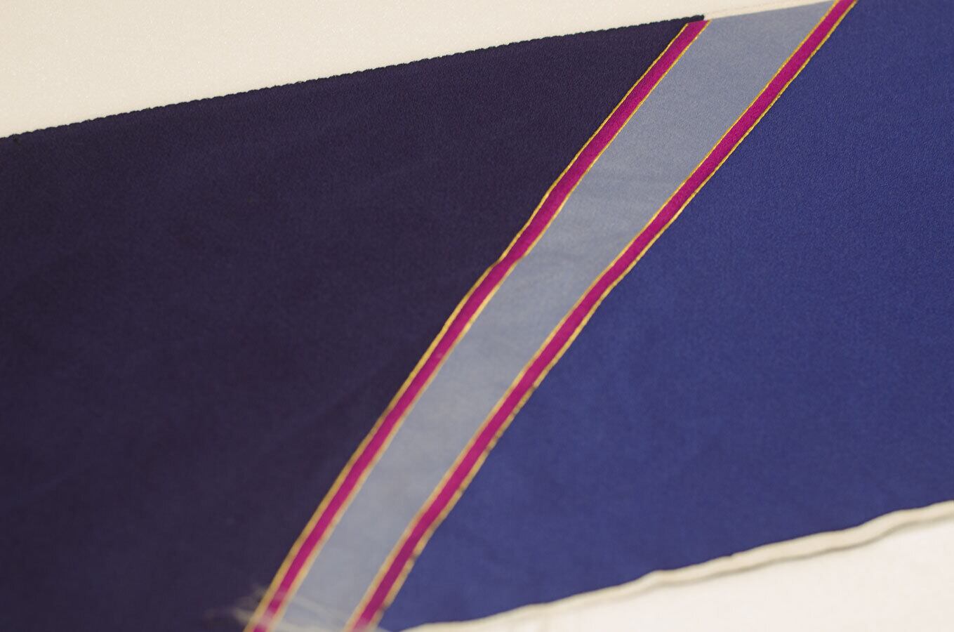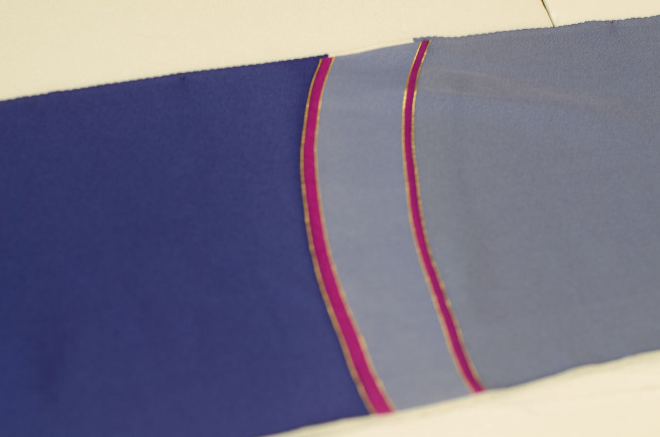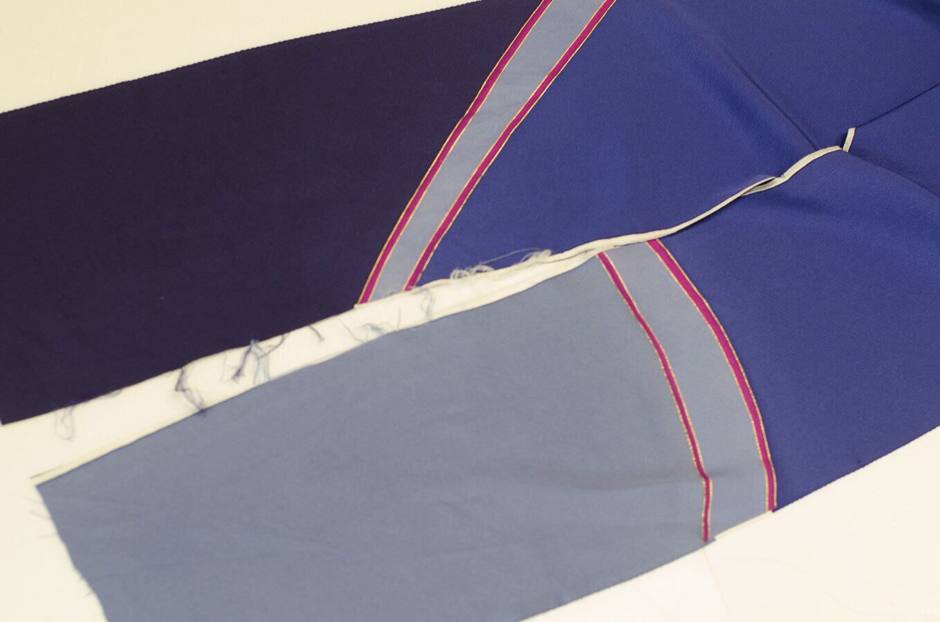 紺色、濃いめの青、灰青の3色のはぎれです。赤のラインがはいっていて、ラインには金彩で縁取りされています。