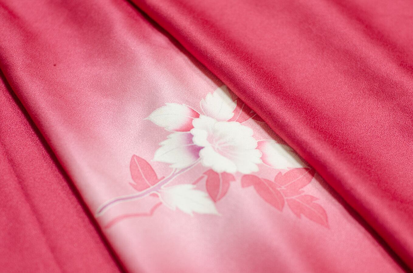 艶のある生地でよくある赤やピンクの着物とはちょっと違うきれいな明るい色です。