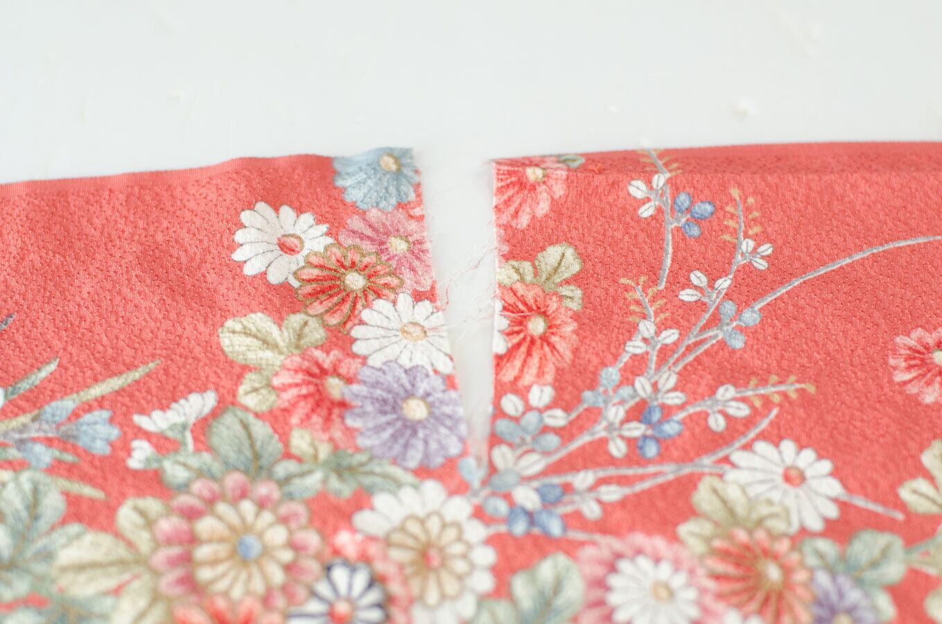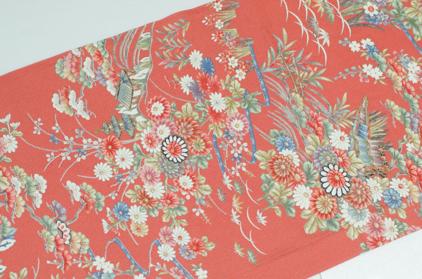 ややシックな落ち着いた赤地に菊、桜、水仙、松、竹と建物が描かれた小紋ハギレです。