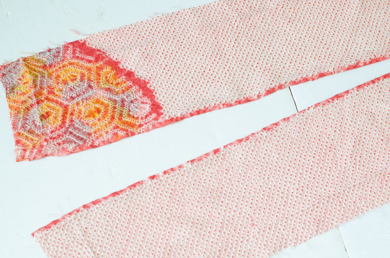 赤をメインで端の方に亀甲の柄がはいった絞りの振袖の解きハギレです。