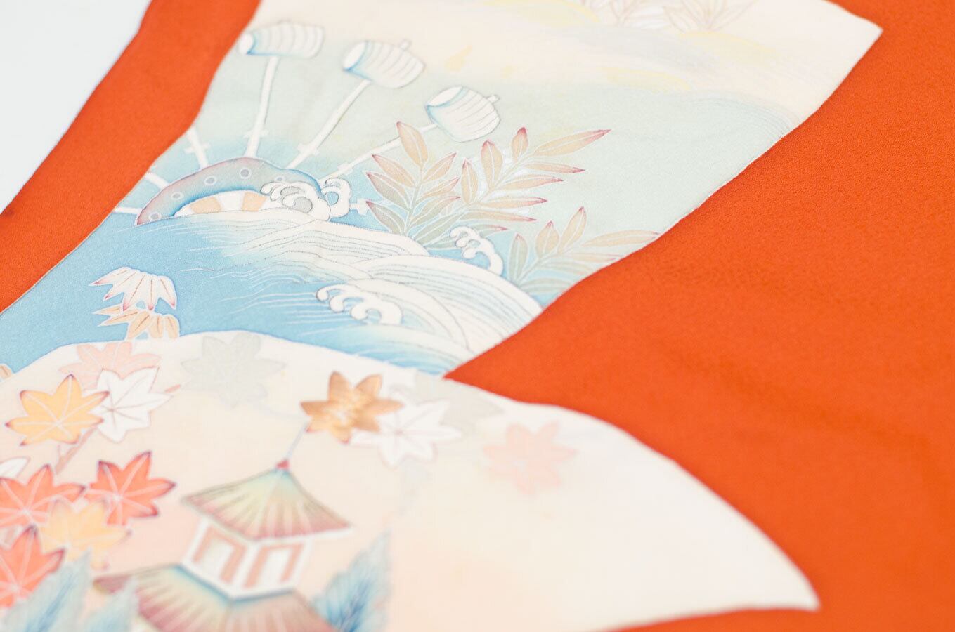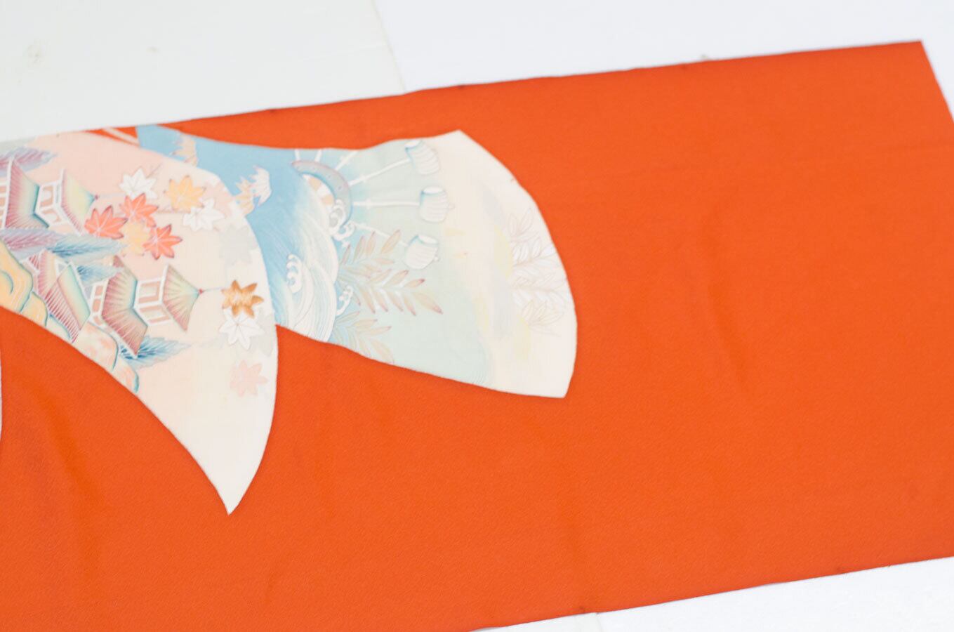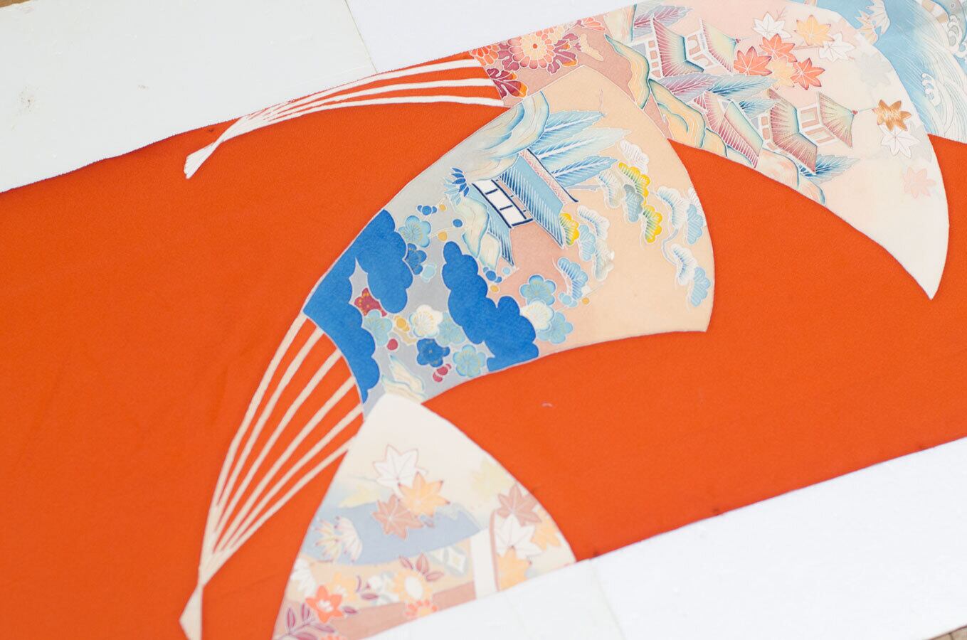 緋色(#d3381c やや黄よりの落ち着いた赤)に扇面柄の訪問着はぎれです。