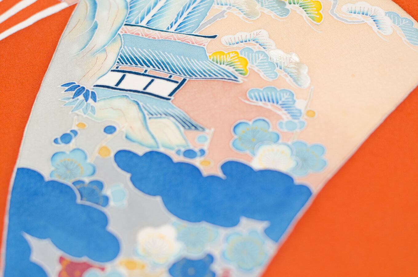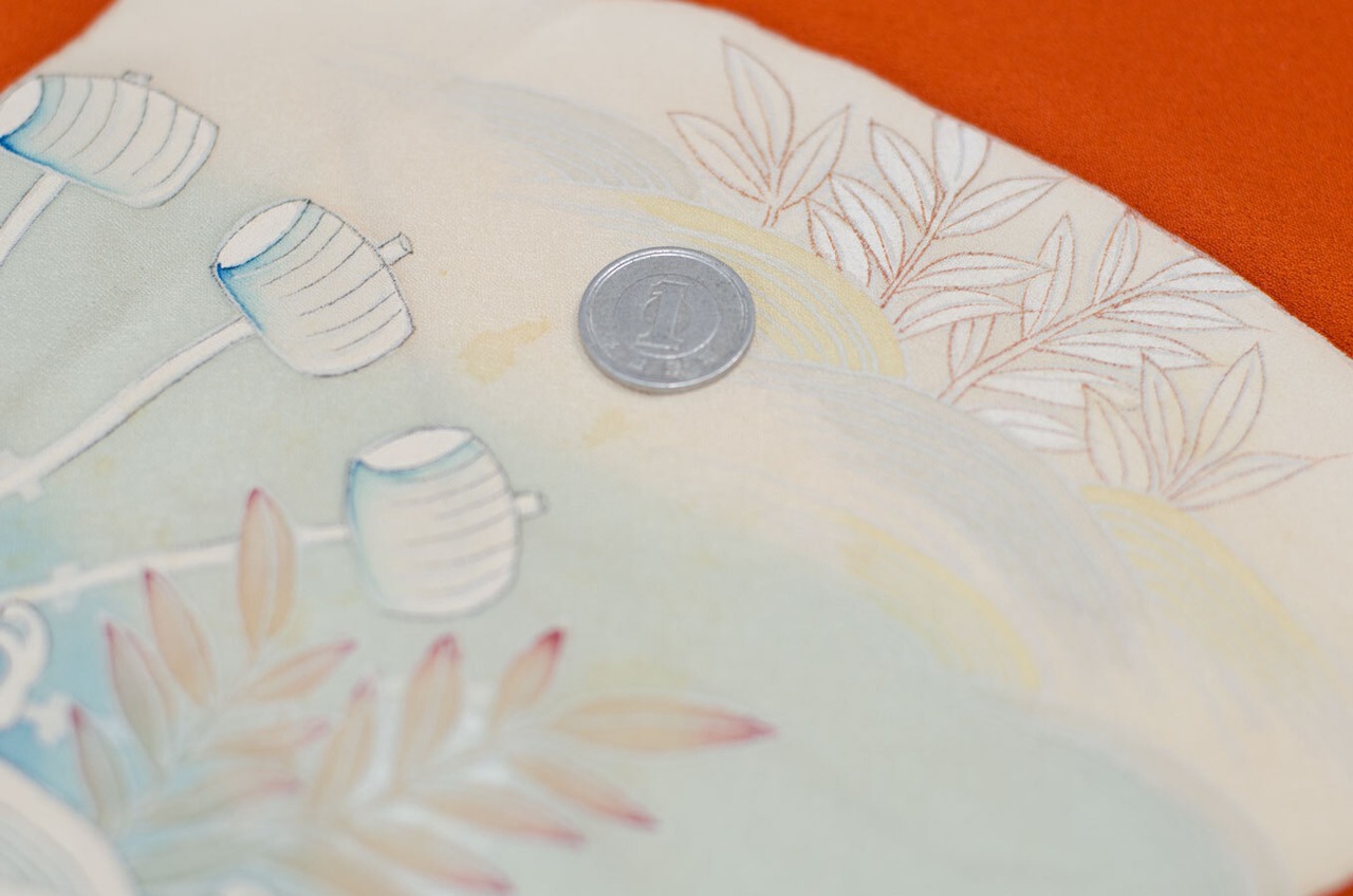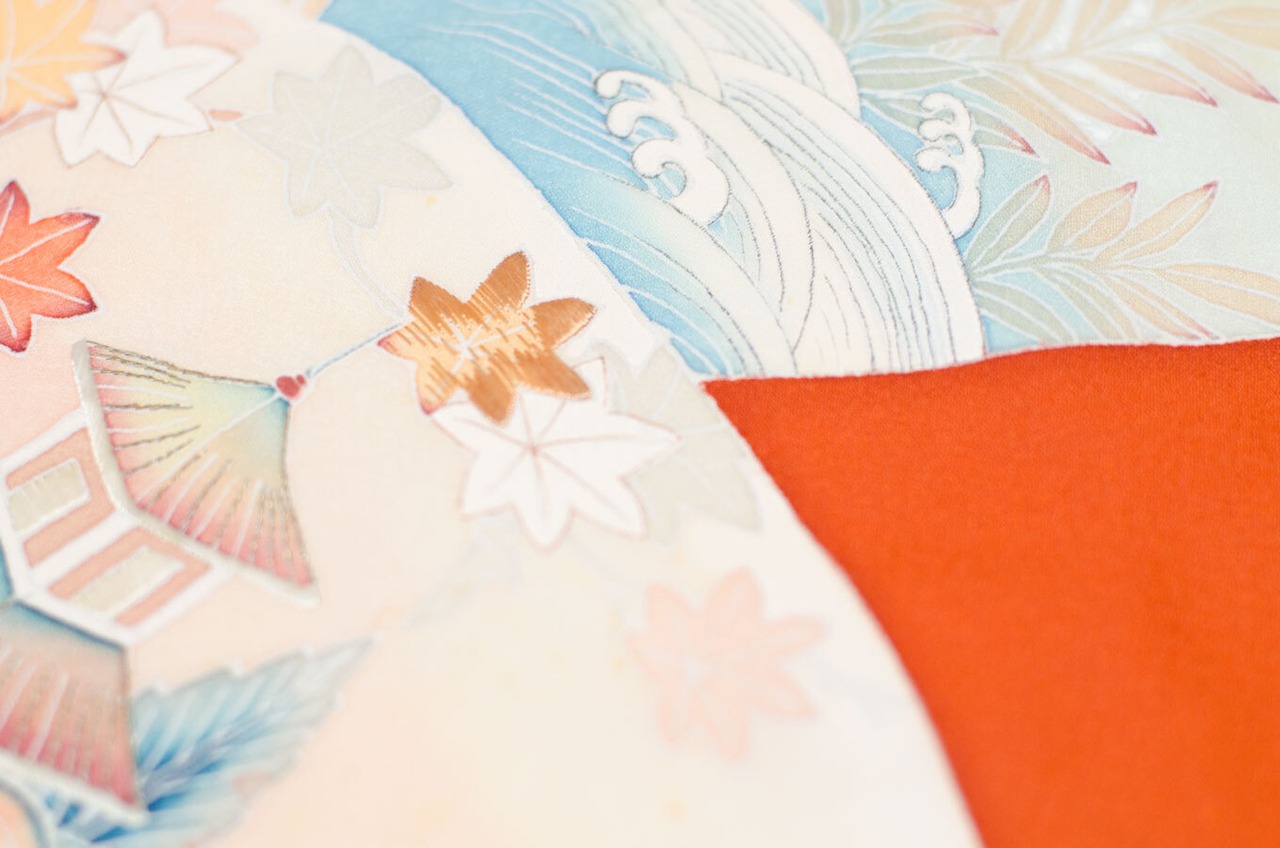 緋色(#d3381c やや黄よりの落ち着いた赤)に扇面柄の訪問着はぎれです。