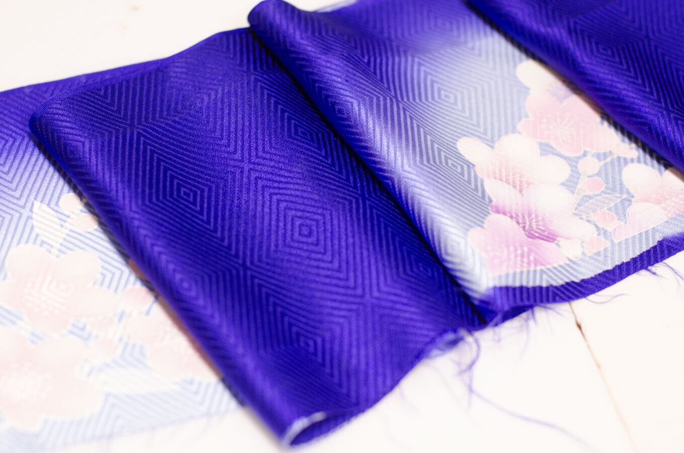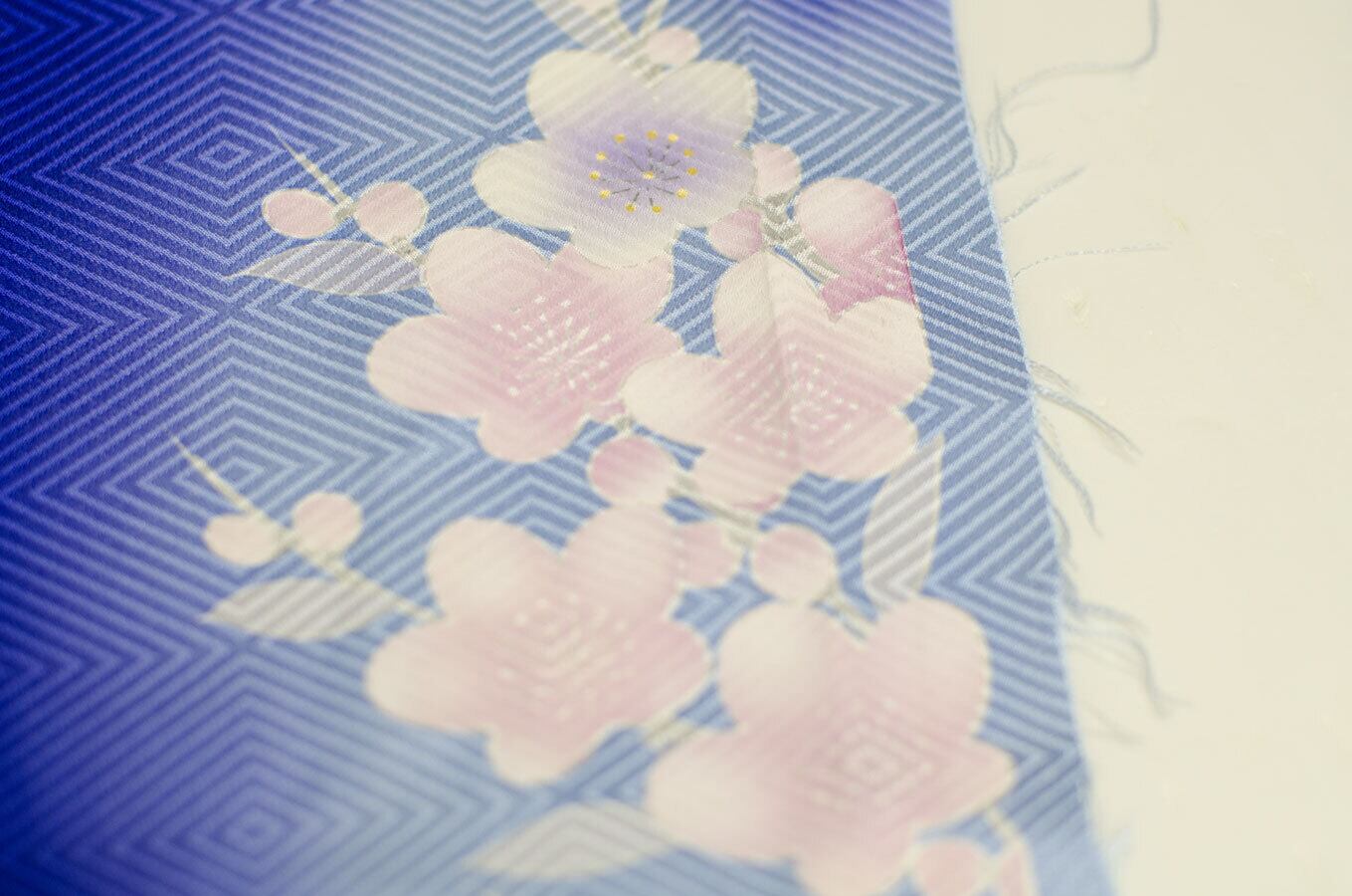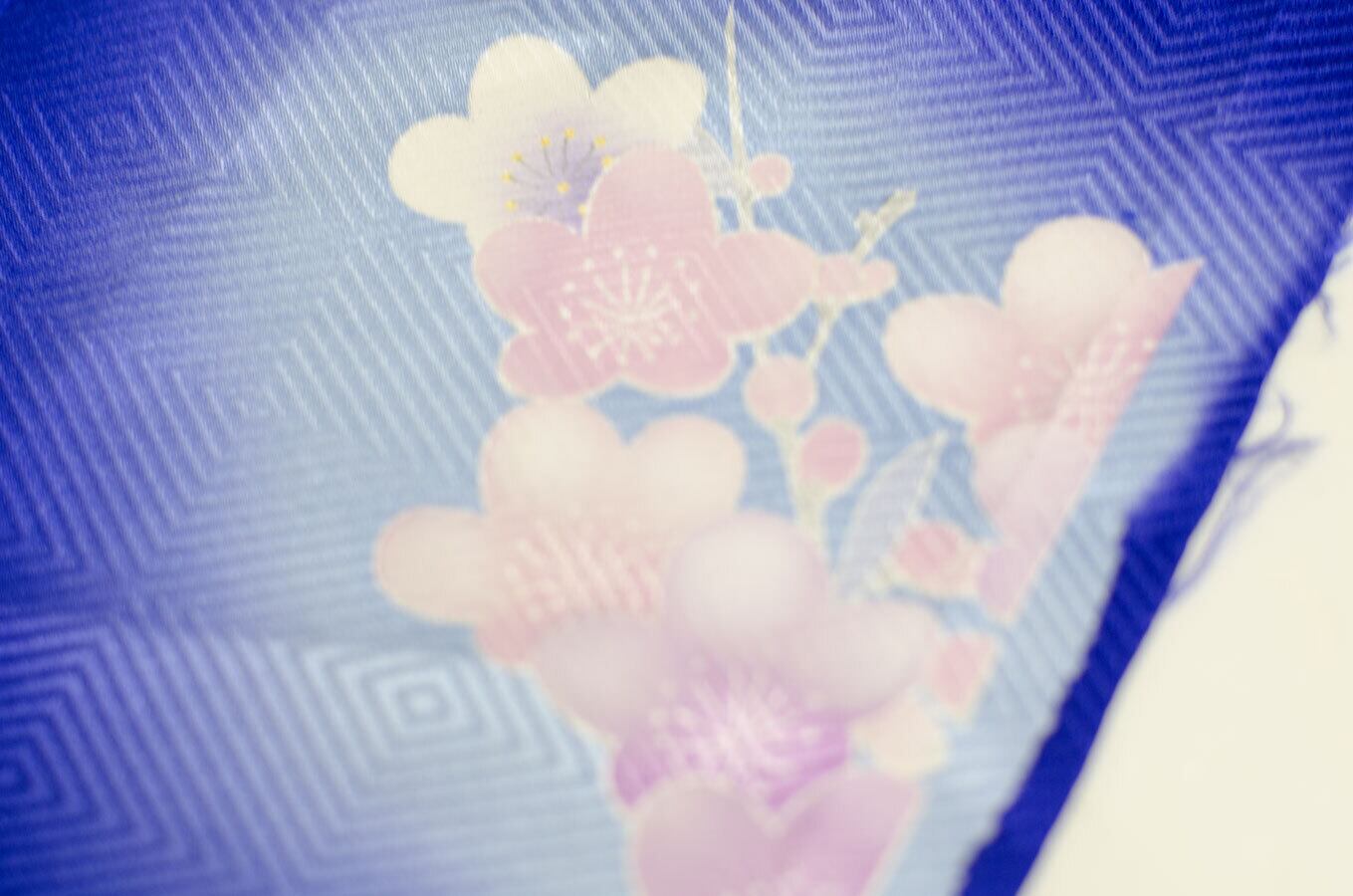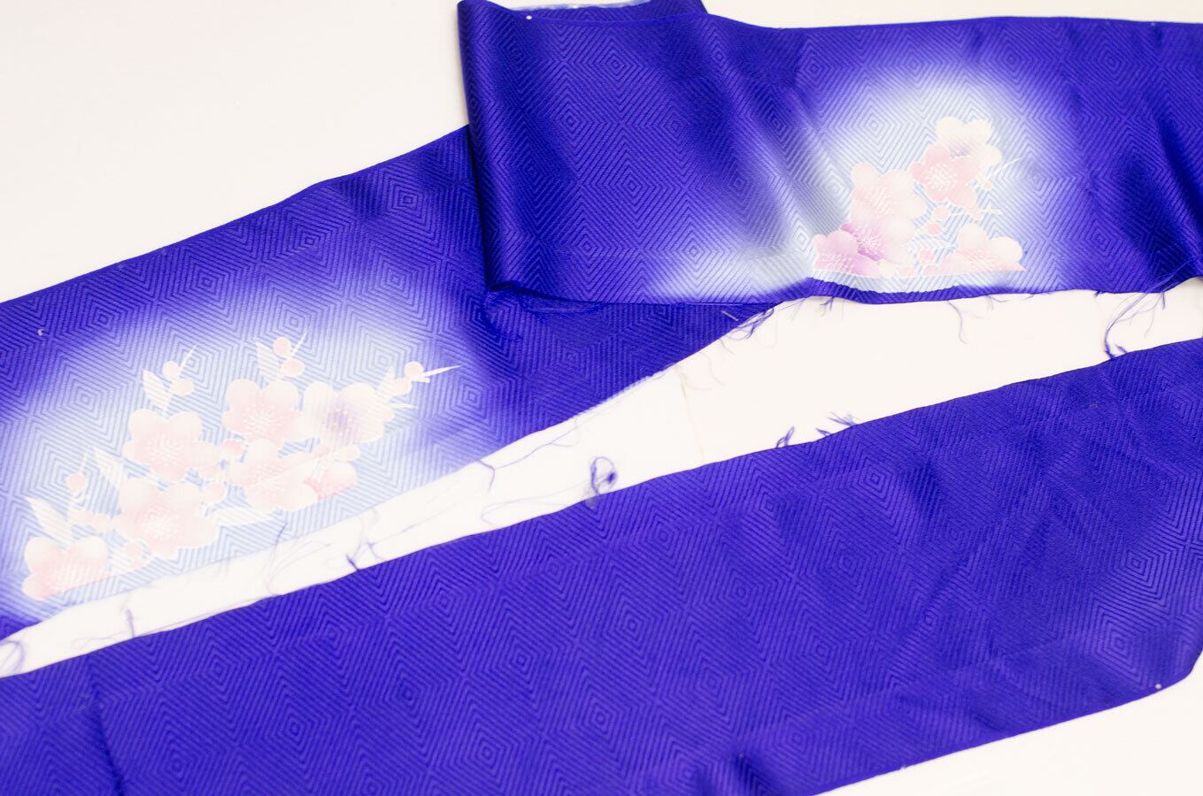クリアな青地に一部梅の柄の振袖ハギレです。