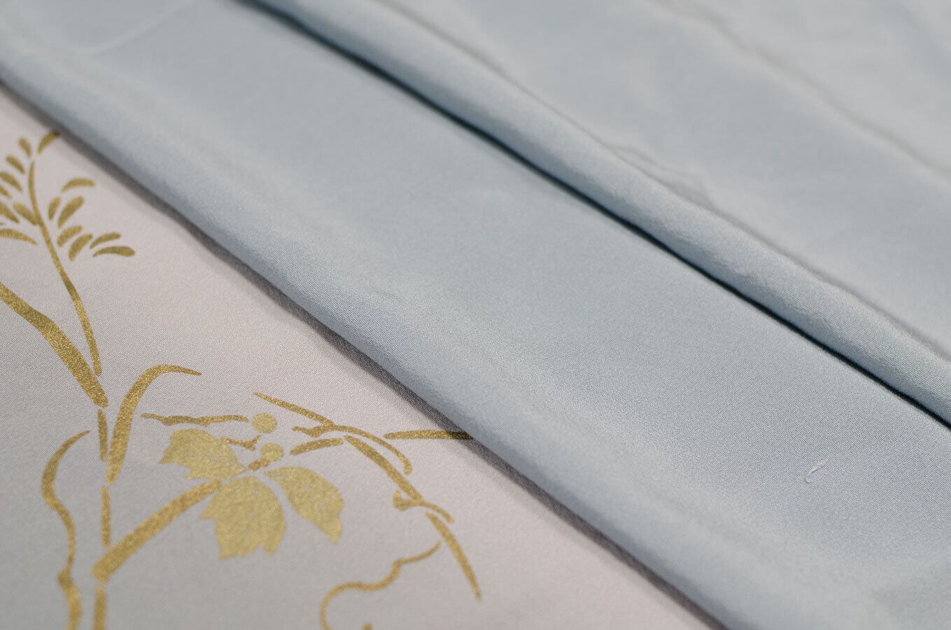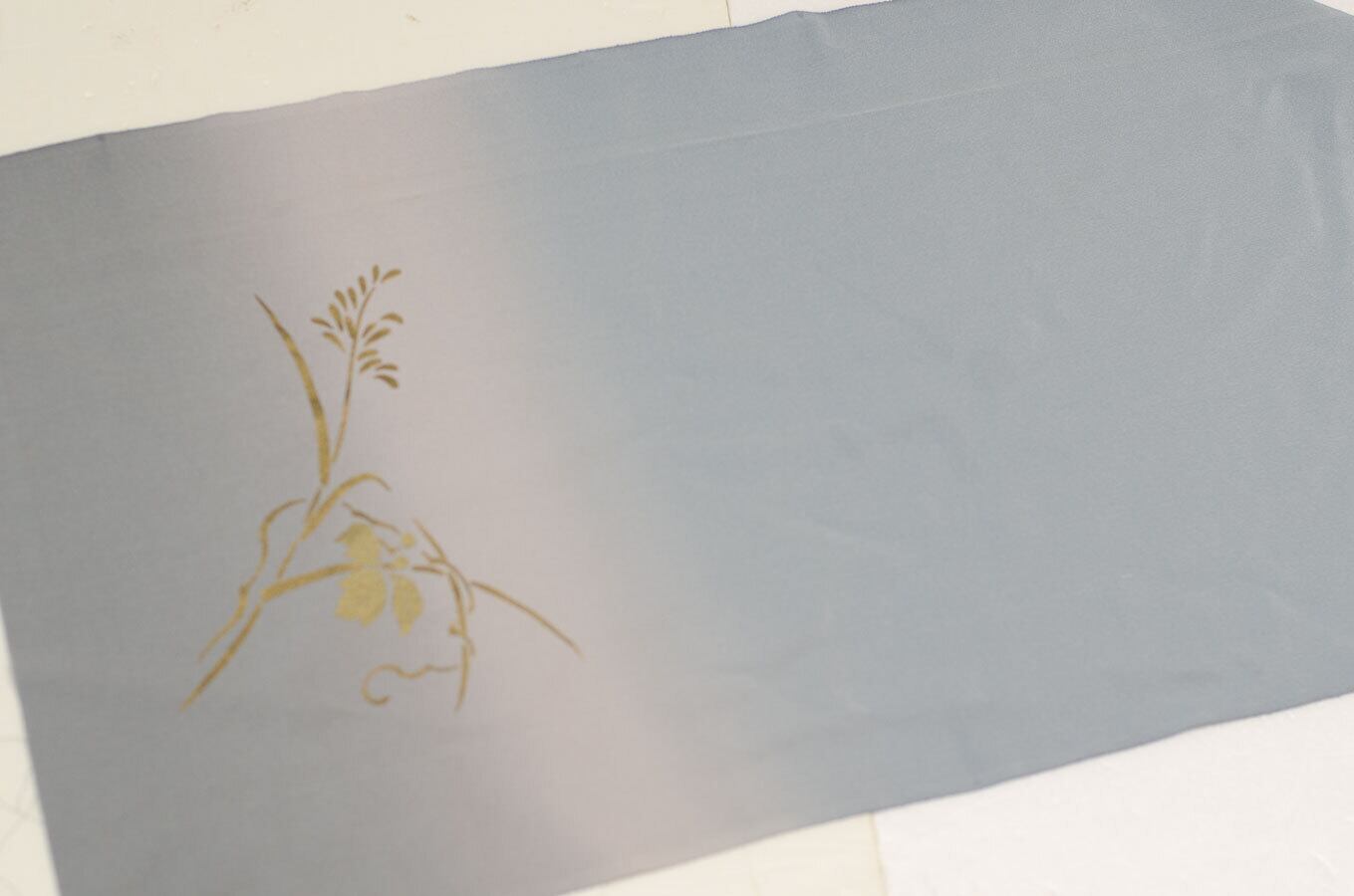 青みのあるグレー地に金彩で柄が描かれた色留袖ハギレです。